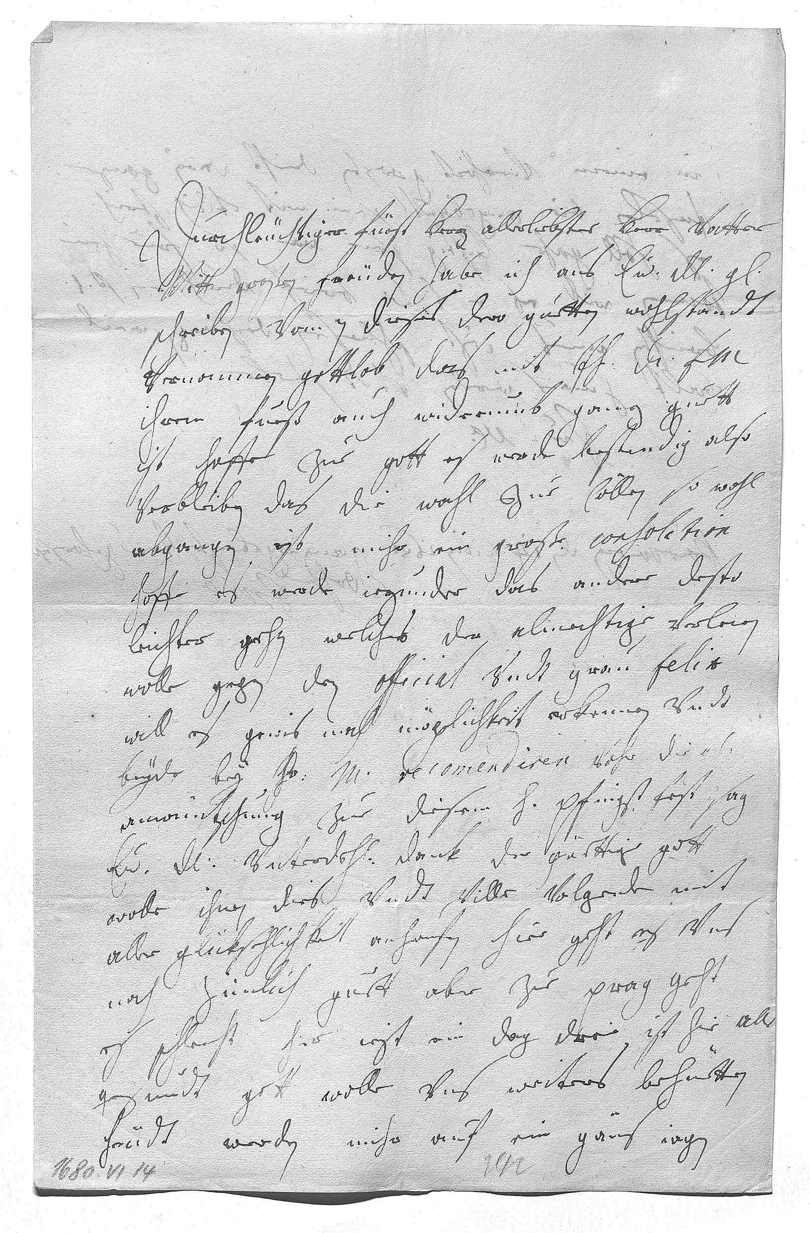 0001Durchleüchtiger Fürst, herz allerliebster herr vatter 0002Mitt großen freüden habe ich aus ewer Durchlaucht gnädigem 0003schreiben vom 7 dieses dero guetten wohlstandt 0004vernommen. Gottlob, das mit ihr Durchlaucht fraw mutter 0005ihrem fueß auch widerumb ganz guett 0006ist, hoffe zue gott, es werde bestendig also 0007verbleiben. Das die wahl zue Cöllen so wohl 0008abgangen, ist mihr ein große consolation, 0009hoffe, es werde iezunder das andere desto 0010leichter gehn, welches der almechtige verleien 0011wolle. Gegen den Official vndt Grau Felix 0012will es gewis nach möglichkeit erkennen vndt 0013beyde bey ihr Mayestät recomendiren. Vohr die gnädige 0014anwüntschung zue diesem heiligen pfingst fest sag 0015ewer Durchlaucht vnterdehnigen dank, der güettige gott 0016wolle ihnen dies vndt ville volgende mit 0017aller glüksehlichkeit anhaufen. Hier geht es vns 0018noch zimlich guett, aber zue Prag geht 0019es schlecht her iest. Ein dag drei ist hie alles 0020gesundt, gott wolle vns weiters behüetten. 0021Heüdt werden mihr auf ein gäns iagen