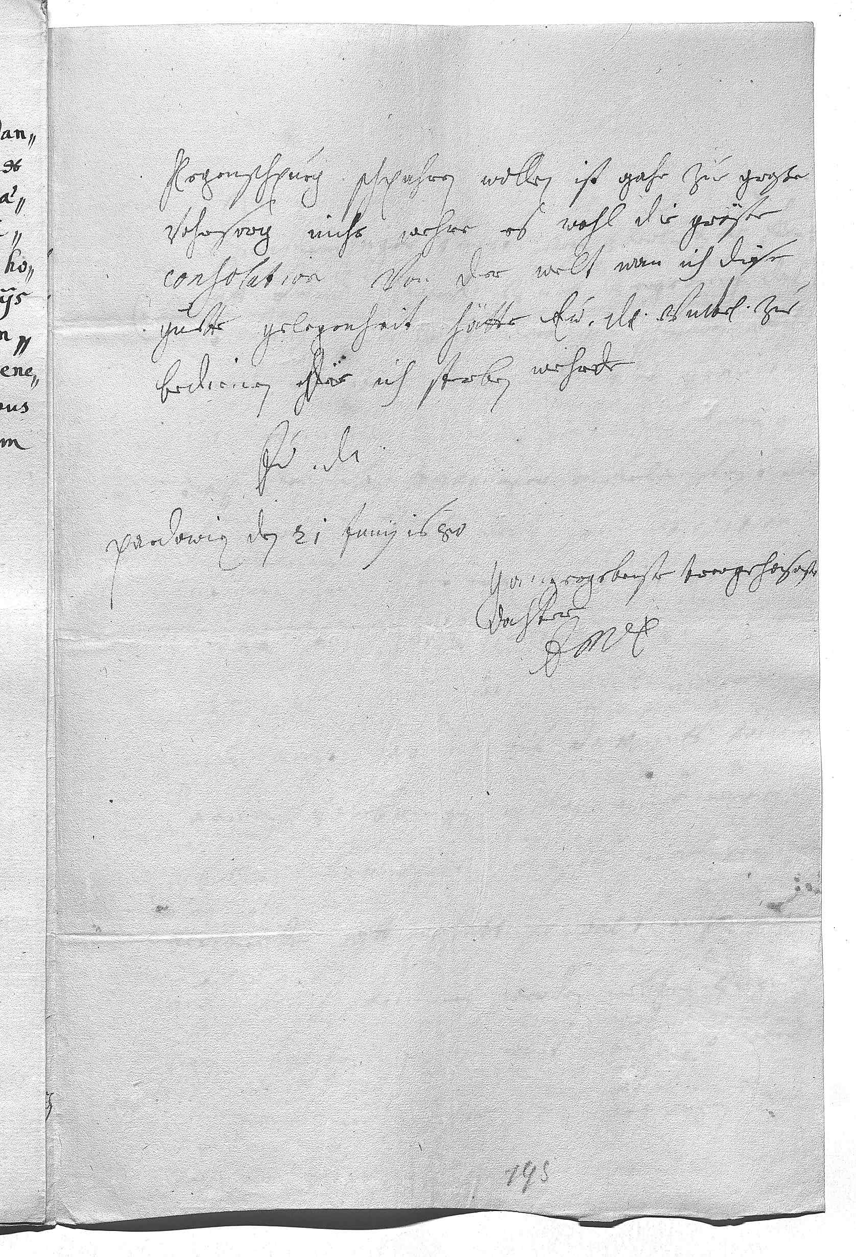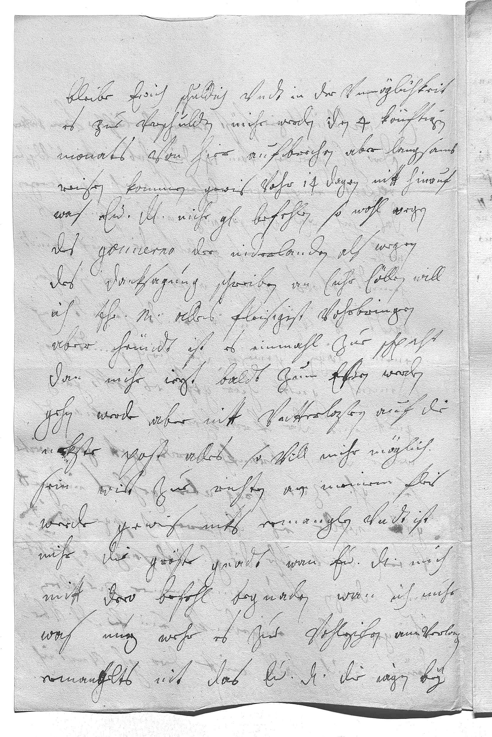 0018bleibe ewich schuldich vndt in der vnmöglichkeit, 0019es zue verschulden. Mihr werden den 4 könftigen 0020monats von hier aufbrechen, aber langsamb 0021reisen, kommen gewis vohr 14 dagen nitt hinauf. 0022Was ewer Durchlaucht mihr gnädig befehlen, so wohl wegen 0023des gouuerno der Niderlanden als wegen 0024des danksagung schreiben an Cuhr Cöllen, will 0025ich ihr Mayestät alles fleisigist vohrbringen, 0026aber heündt ist es einmahl zue schpaht, 0027dan mihr iezt baldt zum eßen werden 0028gehn. Werde aber nitt vntterlaßen, auf die 0029nekste post alles, so vill mihr möglich 0030sein wirt, zue richten. An meinem fleis 0031werde gewis niks ermanglen, vndt ist 0032mihr die gröste gnadt, wan ewer Durchlaucht mich 0033mitt dero befehl begnaden. Wan ich nuhr 0034was nuz wehr, es zue vohlziehen, am verlangen 0035ermangelts nit. Das ewer Durchlaucht die iagen bey