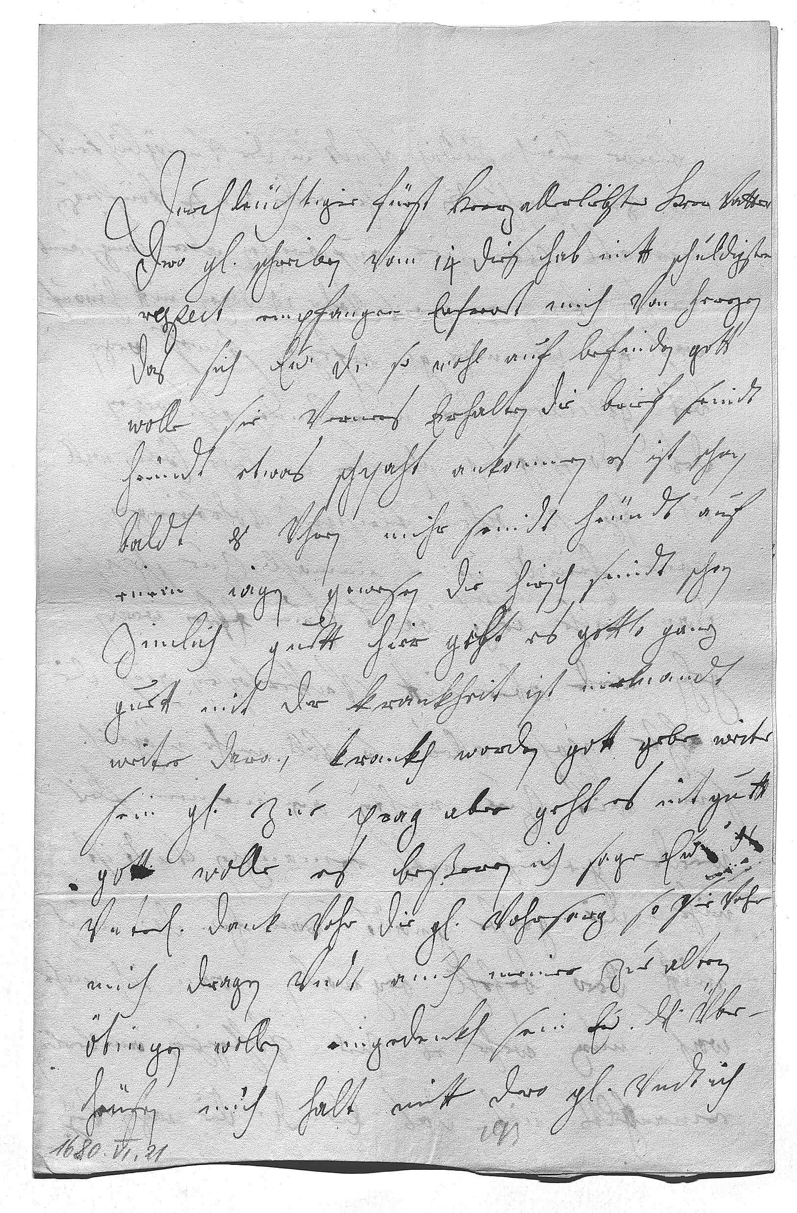 0001Durchleüchtiger Fürst, herzallerliebster herr vatter 0002Dero gnädiges schreiben vom 14 dies hab mit schuldigsten 0003respect empfangen. Erfrewet mich von herzen, 0004das sich ewer Durchlaucht so wohl auf befinden, gott 0005wolle sie verners erhalten. Die brief seindt 0006heündt etwas schpaht ankommen, es ist schon 0007baldt 8 vhren. Mihr seindt heündt auf 0008einem iagen gewesen, die hirsch seindt schon 0009zimlich guett. Hier geht es gottlob ganz 0010guett mit der krankheit, ist niemandt 0011weiter daran krankh worden, gott gebe weiter 0012sein gnad . Zue Prag aber geht es nit guett, 0013gott wolle es beßeren. Ich sage ewer Durchlaucht 0014vnterdehnigsten dank vohr die gnädige vohrsorg, so sie vohr 0015mich dragen vndt auch meiner zue Alten 0016Ötingen wollen eingedenkh sein. Ewer Durchlaucht über- 0017heüfen mich halt mitt dero gnade, vndt ich