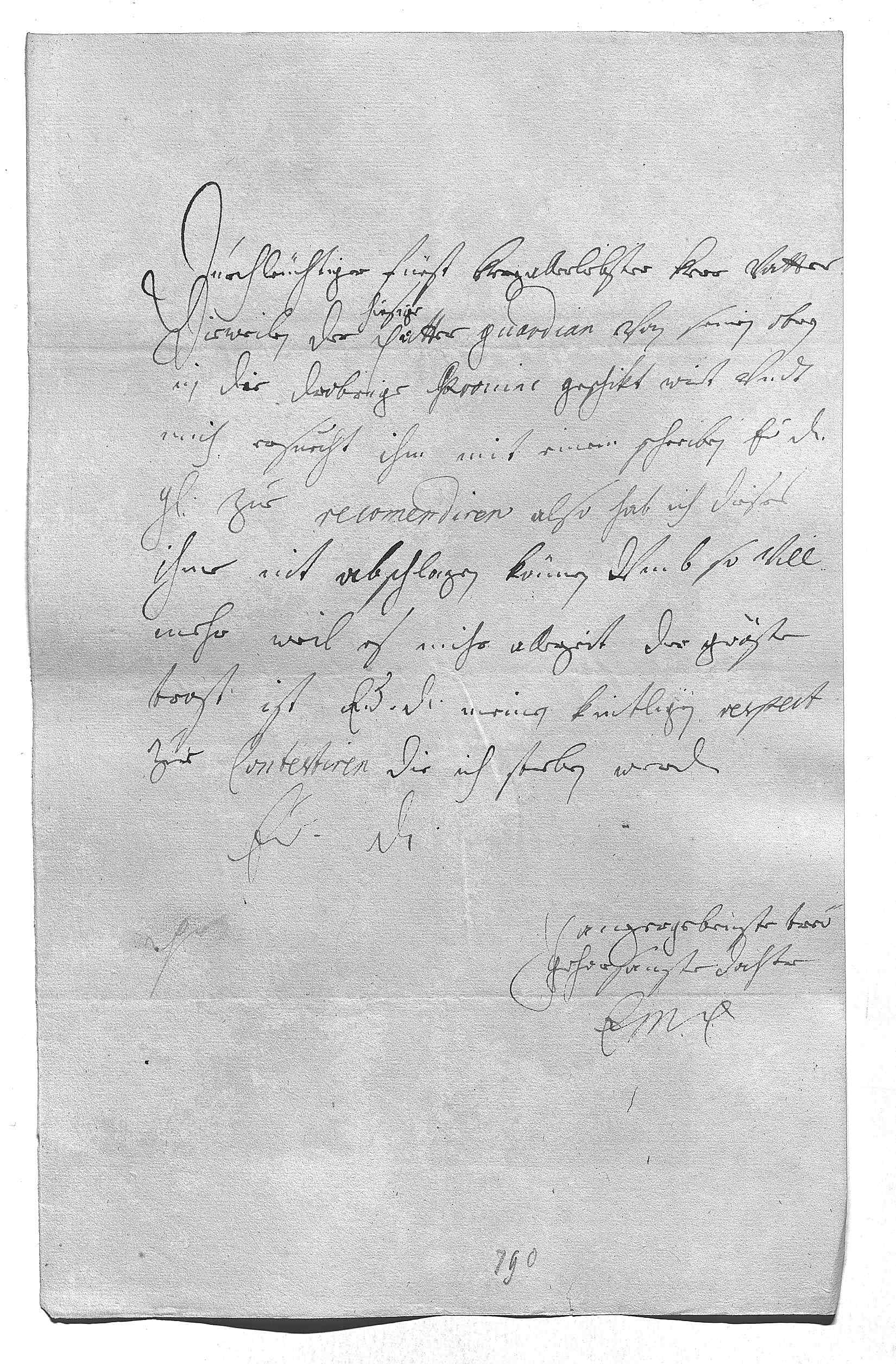 0001Durchleüchtiger Fürst, herzallerliebster herr vatter 0002Dieweilen der hiesigepatter guardian von seinen obren 0003in die drobrige prouinc geschikt wirt vndt 0004mich ersucht, ihm mit einem schreiben ewer Durchlaucht 0005gnädig zue recomendiren, also hab ich dieses 0006ihme nit abschlagen können, vmb so vill 0007mehr, weil es mihr allezeit der gröste 0008trost ist, ewer Durchlaucht meinen kintligen respect 0009zue contestiren, die ich sterben werde 0010ewer Durchlaucht 0011ganzergebenste treü 0012gehorsamste dochter 0013EMT