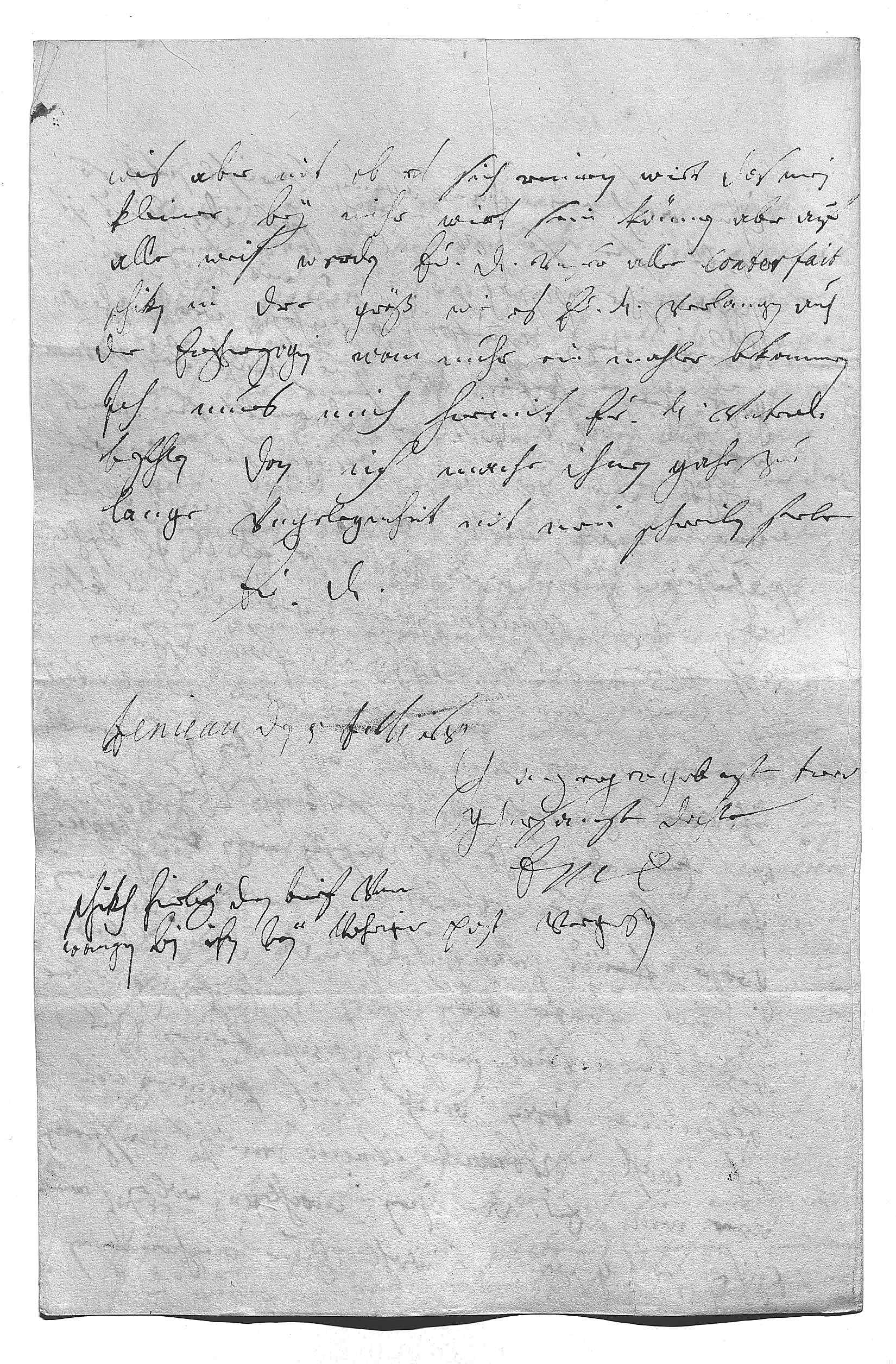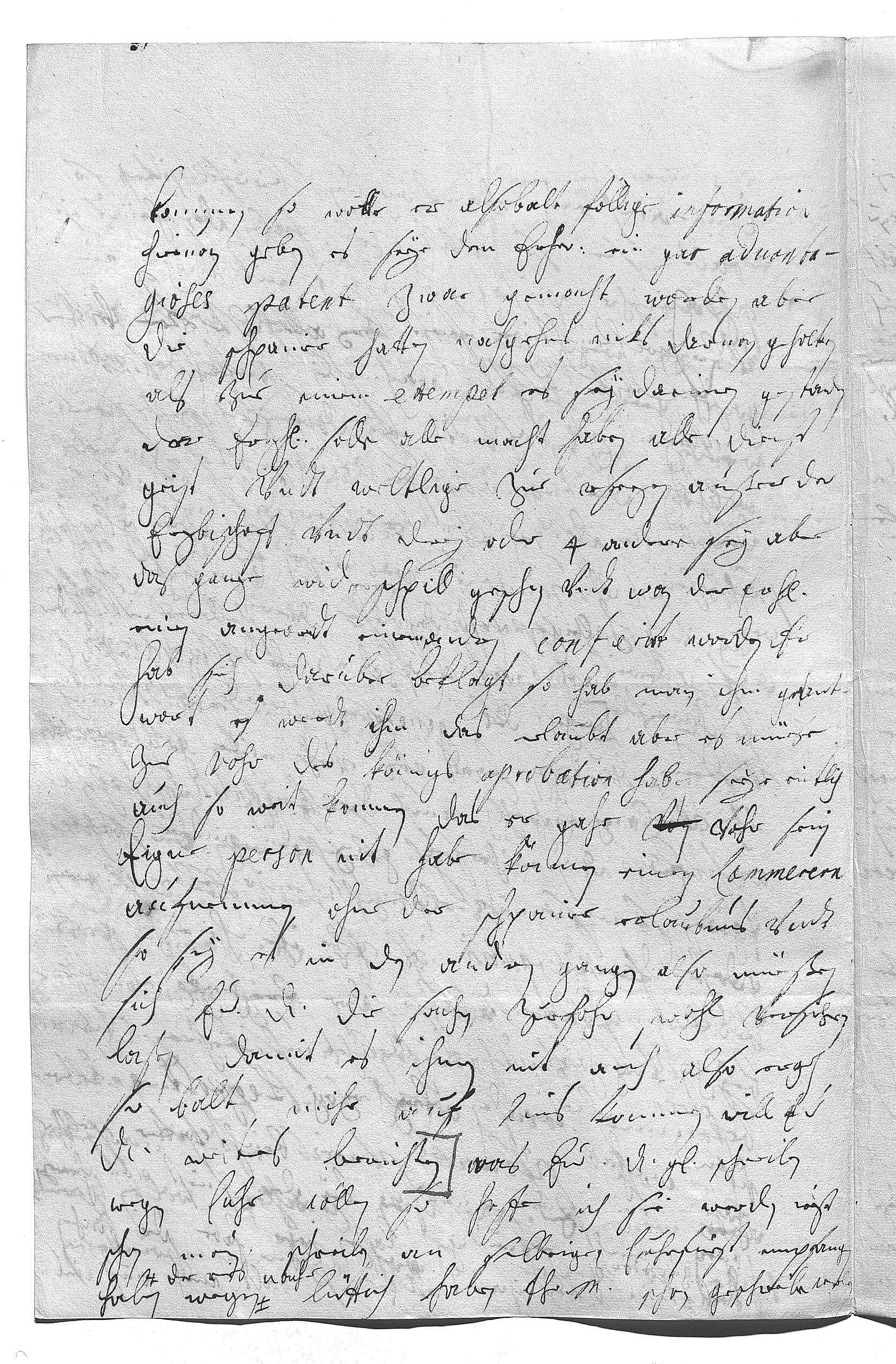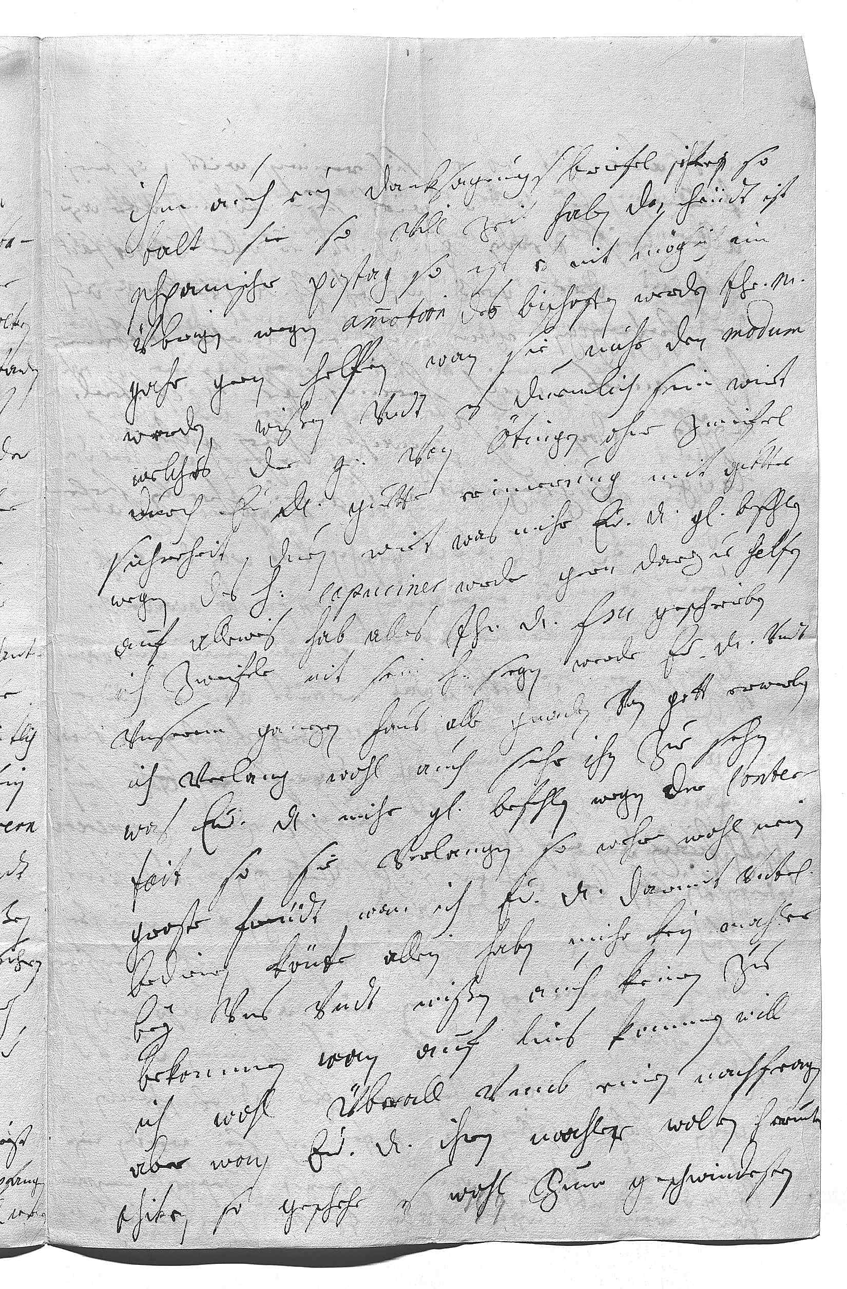 0001Durchleüchtiger Fürst, herz allerliebster her vatter 0002Ich bitte ewer Durchlaucht nachmahlen vnterdehnigst vmb 0003verzeiung, das ich bey vohriger post so 0004kurz müeßen abrechen. Iezt mues ich vohr 0005kommen, habe bey selbiger post dero gnädiges schreiben 0006vom 21 dies vndt auch erst das vom lezten maij0007mit derselbigen post erhalten, dan sie der Schellerer nit ehnder 0008bekommen hatt. Was ewer Durchlaucht mihr selbiges mahl gnädig 0009befohlen, wegen des gouerno von Niderlandt mich 0010zue erkundigen, was es vohr eine beschaffenheit 0011mit dem Erzherzoch vndt der Infantin Isabella 0012gehabt, so ist dieses ganz ein andere sach 0013gewesen, wie mihr ihr Mayestät mihr selber gnädig gesagt, 0014dan die Infantin es vohr ihr heiraht guett 0015bekommen vndt also der Erzherzog es vohr 0016eigen gehabt hatt, welches sich hier nit prac- 0017ticiren lies. Den Erzherzog Leopold anbetre- 0018ffendt hab ich durch mein beichtvatter, welcher 0019gahr ein feiner man ist, bey dem Fürst von Schwarzen- 0020burg mich erkundigen laßen. Ehr habe die sachen 0021da zu Pardowiz nit bey handt, aber so balt mihr auf Lins