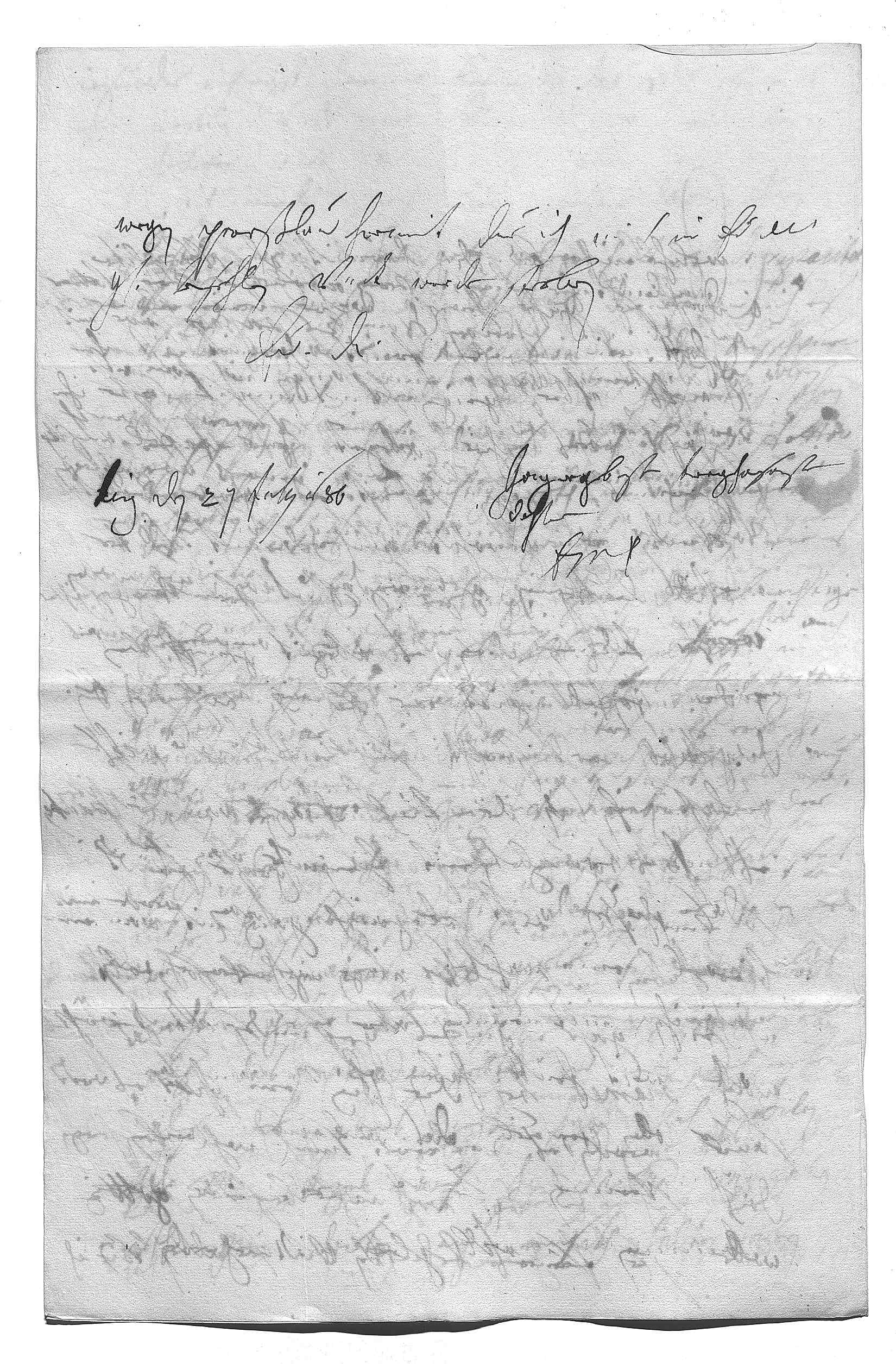 0021bestehn, wan mihr gott gelegenheit vndt capacitet 0022verleyen wirt, ewer Durchlaucht zue dienen, wie ich es 0023verlange. Die expedition in der auschpur- 0024gischen sach werden ewer Durchlaucht hoffentlich schon 0025empfangen haben, dan es durch ein staffetta 0026verwichenen son oder erchtag wekh ist, auch wegen 0027des Fukers alles eingericht worden, wie es 0028ewer Durchlaucht gnädig verlangt haben. Der almechtige 0029verleye einen gelükhligen effect in 0030dieser sachen, welches ich wohl von herzen 0031wüntsche. Hier seint mihr auch alle wohl auf, 0032haben kein andere zeit verdreib außer der 0033iagen, der mihr mihr noch eins gehabt vnt 0034bis könftigen erichtag das andre haben werden, 0035als des abens ins gertel zue gehn, welches 0036wohl gahre klein ist, ein wehnig größer 0037als das paradeis gertel zue Wien, woh mihr 0038als des abens geßen haben, dah schpilen 0039ihr Mayestät kegel. Auf Sankt Maria Magdalena dag haben 0040ihr Mayestät dorten ein musikh halten laßen,