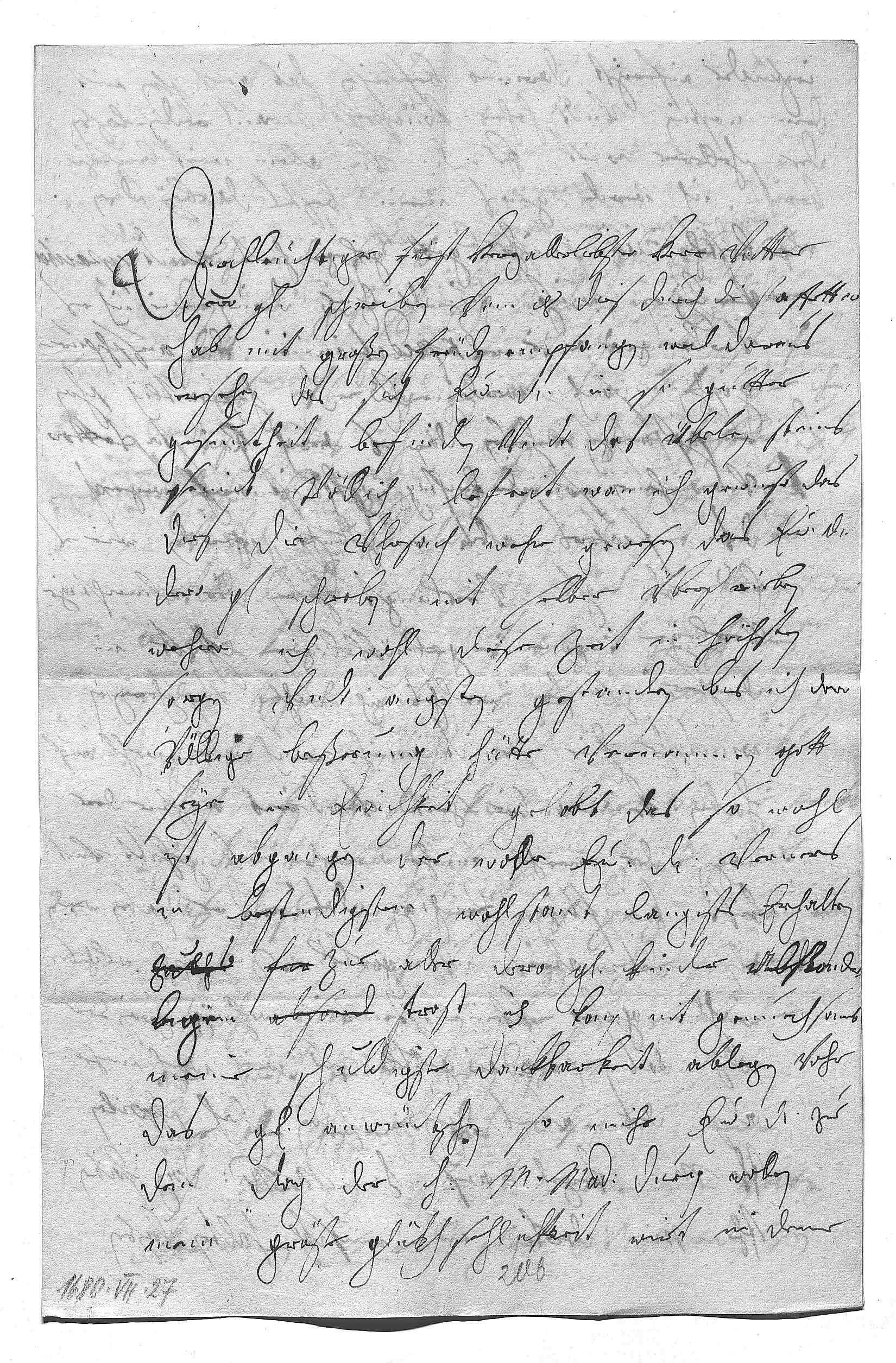0001Durchleüchtiger Fürst, herzallerliebster herr vatter 0002Dero gnädiges schreiben vom 18 dies durch die staffetta 0003hab mit großen freüden empfangen, weil daraus 0004ersehen, das sich ewer Durchlaucht in so guetter 0005gesuntheit befinden vndt des übelen steins 0006seint völlich befreit. Wan ich gewust, das 0007dies die vhrsach wehre gewesen, das ewer Durchlaucht 0008dero gnädiges schreiben nit selber überschrieben, 0009wehre ich wohl diese zeit in höchsten 0010sorgen vndt angsten gestanden, bis ich dero 0011völlige beßerung hätte vernommen. Gott 0012seye in ewichkeit gelobt, das so wohl 0013ist abgangen, der wolle ewer Durchlaucht verners 0014in bestendigstem wohlstant langists erhalten 0015??? fer zue aller dero gehorsamen kinder absonder- 0016ligem absond trost. Ich kan nit genuechsamb 0017meine schuldigste dankbarheit ablegen vohr 0018das gnädige anwüntschen, so mihr ewer Durchlaucht zue 0019dem dag der heiligen Maria Magdalena duen wollen. 0020Mein gröste glükhsehlichkeit wirt in deme