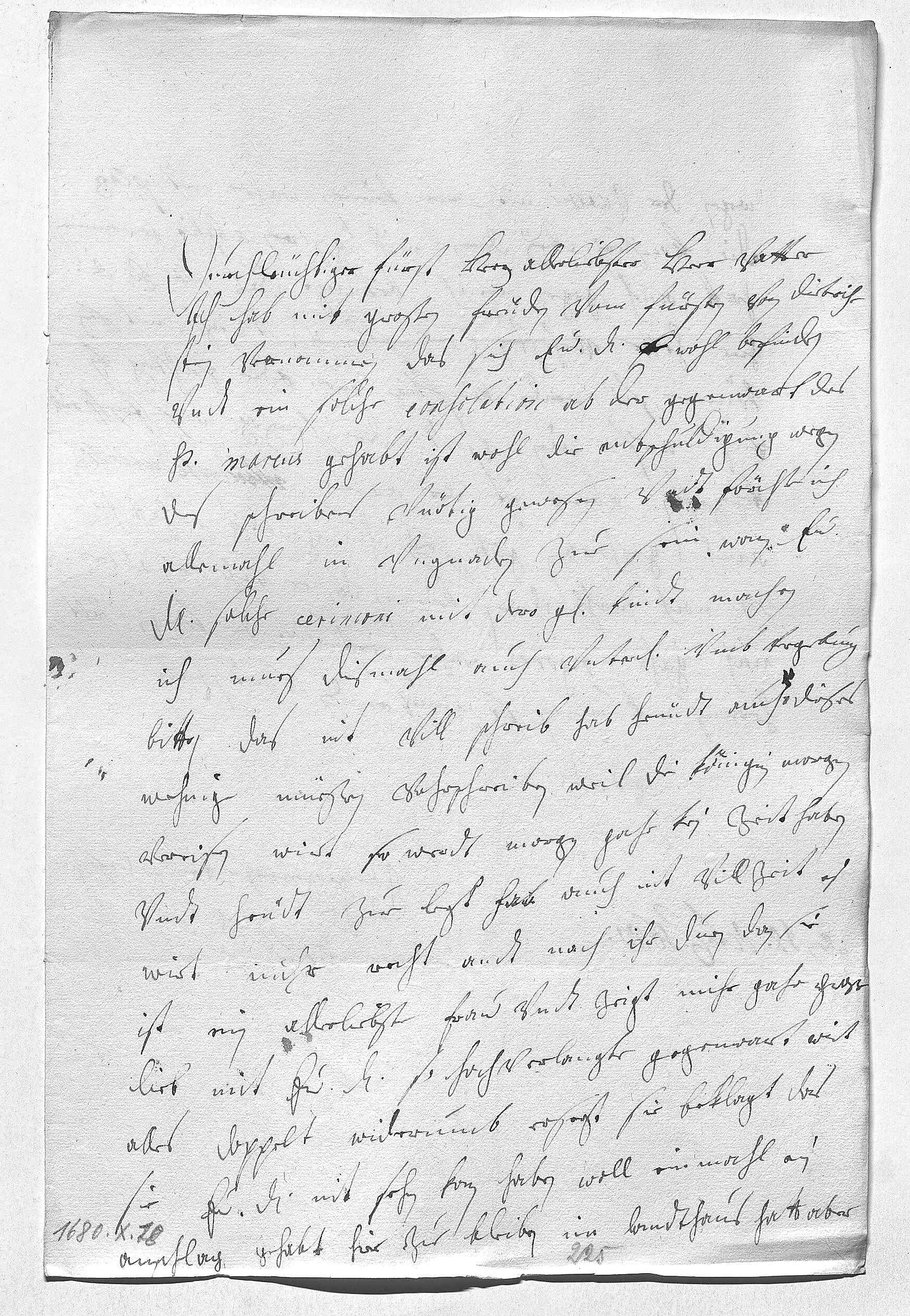 0001Durchleüchtiger Fürst, herz allerliebster herr vatter 0002Ich hab mit großen freüden vom Fürsten von Dietrich- 0003stein vernommen, das sich ewer Durchlaucht so wohl befinden 0004vndt ein solche consolation ab der gegenwart des 0005Pater Marcus gehabt. Ist wohl die entschuldigung wegen 0006des schreibens vnötig gewesen, vndt förchte ich 0007allemahl in vngnaden zue sein, wan ewer 0008Durchlaucht solche cerimoni mit dero gehorsamsten kindt machen. 0009Ich mues dismahl auch vnterdehnigst vmb vergebung 0010bitten, das nit vill schreib. Hab heündt auch dieses 0011wehnige müeßen vohrschreiben, weil die Königin morgen 0012vereisen wirt, so werdt morgen gahr kein zeit haben 0013vndt heüdt zue lezt hab auch nit vill zeit. Es 0014wirt mihr recht andt nach ihr duen, dan sie 0015ist ein allerliebste fraw vndt zeigt mihr gahr große 0016lieb. Mit ewer Durchlaucht so hochverlangte gegenwart wirt 0017alles doppelt widerumb ersezt. Sie beklagt, das 0018sie ewer Durchlaucht nit sehn kan. Haben woll einmahl ein 0019anschlag gehabt hier zue bleiben im landthaus, hatt aber