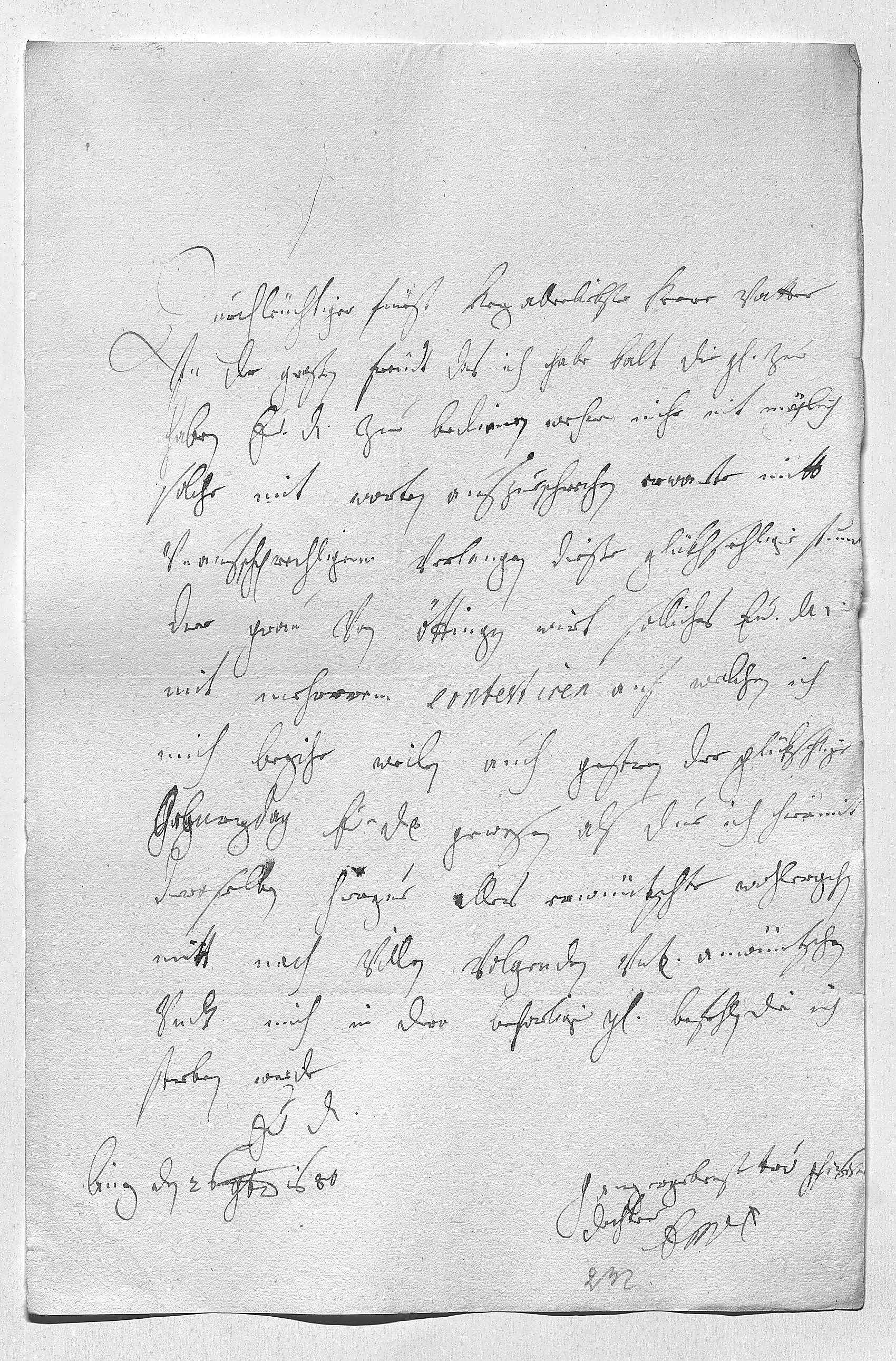0001Durchleüchtiger Fürst herzallerliebster herr vatter 0002In der großen freüdt, das ich habe, balt die gnade zue 0003haben ewer Durchlaucht zue bedienen, wehre mihr nit möglich, 0004solche mit worten auszueschprechen. Erwarte mitt 0005vnauschprechligem verlangen dieße glükhsehlige stund. 0006Der Grau von Öttingen wirt solliches ewer Durchlaucht 0007mit mehrerem contestiren, auf welchen ich 0008mich bezihe. Weilen auch gestren der glükhsehlige 0009geburzdag ewer Durchlaucht gewesen, als due ich hiermit 0010deroselben hierzue alles erwüntschte wohlergehn 0011mitt nach villen volgenden vnterdehnigsten anwüntschen 0012vndt mich in dero beharlige gnade befehlen, die ich 0013sterben werde 0014ewer Durchlaucht 0015ganzergebenste trew gehorsamste 0016dochter 0017EMT 0018Linz den 26 novembris 1680