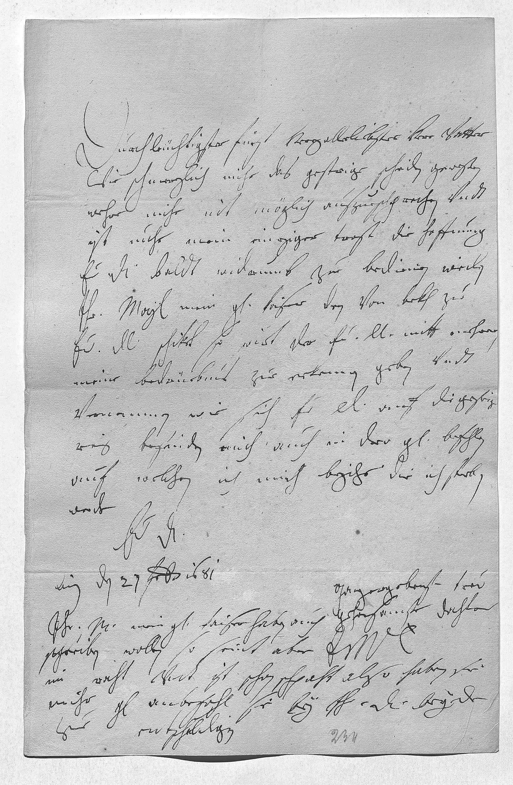 0001Durchleüchtigster Fürst herzallerliebster herr vatter 0002Wie schmerzlich mihr das gestrige scheiden geweßen, 0003wehre mihr nit möglich auszueschprechen, vndt 0004ist nuhr mein einziger trost die hoffnung, 0005ewer Durchlaucht baldt widrumb zue bedienen. Weilen 0006ihr Mayestät, mein gnädiger Kaiser, den von Bekh zue 0007ewer Durchlaucht schiket, so wirt der ewer Durchlaucht mitt mehrerm 0008meine bedrüebnus zue erkennen geben vndt 0009vernemmen, wie sich ewer Durchlaucht auf die gestrige 0010reis befinden, auch in dero gnade befehlen, 0011auf welchen ich mich bezihe, die ich sterben 0012werde 0013ewer Durchlaucht 0014ganzergebenste trew 0015gehorsamste dochter 0016EMT 0017Lins den 27 februarij 16810018Ihr Mayestät, mein gnädiger Kaiser, haben auch 0019schreiben wollen, so seint aber 0020im raht vndt ist schon schpaht, also haben sie 0021mihr gnädig anbefohlen, sie bey ihr Durchlaucht beyde 0022zue entschuldigen.