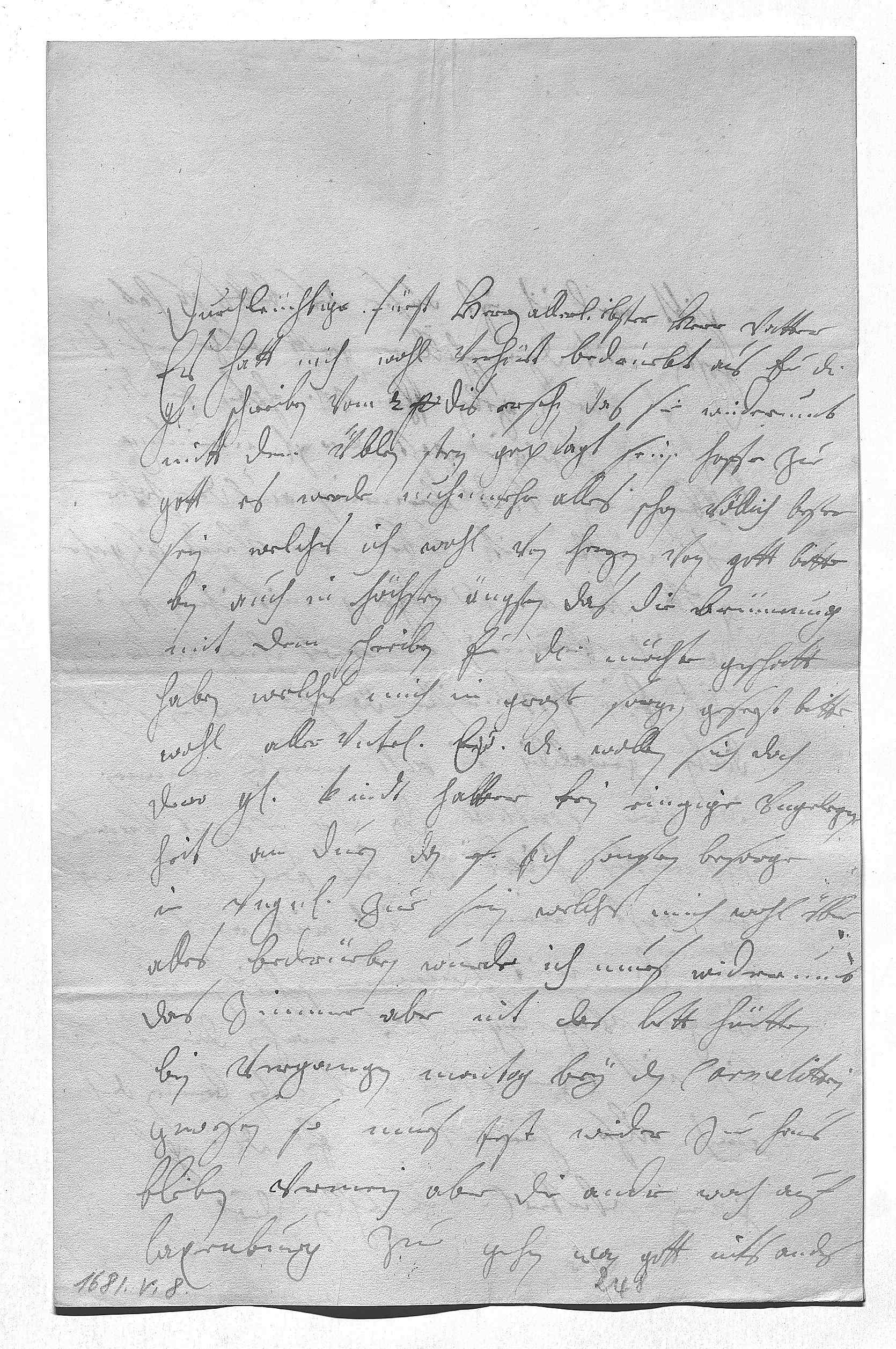 0001Durchleüchtiger Fürst, herz allerliebster herr vatter 0002Es hatt mich wohl vnerhört bedruebt, aus ewer Durchlaucht 0003gnädigem schreiben vom 2 p dis zu ersehn, das sie widerumb 0004mitt dem üblen stein geplagt sein. Hoffe zue 0005gott, es werde nuhnmehr alles schon völlich beßer 0006sein, welches ich wohl von herzen von gott bitte. 0007Bin auch in höchsten ängsten, das die bemüeung 0008mit dem schreiben ewer Durchlaucht möchte geschatt 0009haben, welches mich in große sorgen gesezt. Bitte 0010wohl aller vnterdehnigst, ewer Durchlaucht wollen sich doch 0011dero gehorsamen kindt halber kein einzige vngelegen- 0012heit an duen, dan si ich sonsten besorge 0013in vngnaden zue sein, welchs mich wohl über 0014alles bedrüeben wurde. Ich mues widerumb 0015das zimmer, aber nit das bett hüetten, 0016bin vergangen montag bey den carmeliterin 0017gewesen, so mues jetzt wider zue haus 0018bleiben. Vermeinen aber die ander woch auf 0019Laxenburg zue gehn, wan gott niks anders