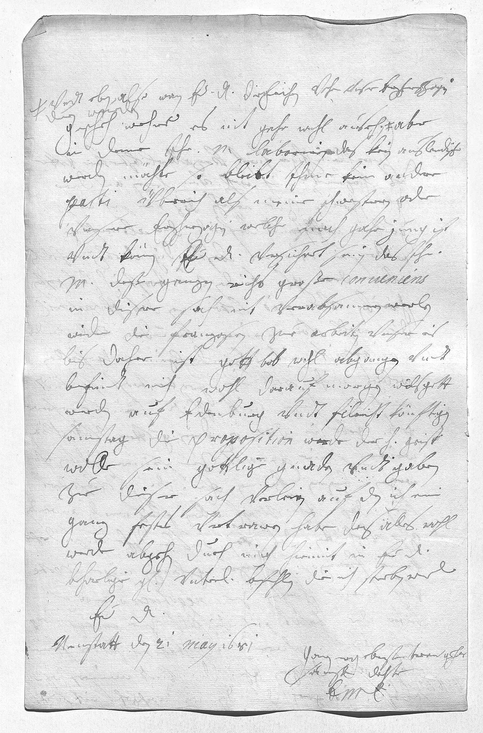 0023vndt eben also, wan ewer Durchlaucht dergleichen vohr vnser Erzherzogin 0024gescheh, wehre es nit gahr wohl ausehn. Aber 0025in deme ihr Mayestät laboriren, das kein auslendische 0026werden möchte, so bleibt ihme keine andere 0027parti überich als meine schwestern oder 0028vnsere Erzherzogin, welche noch gahr jung ist. 0029Vndt können ewer Durchlaucht versichret sein, das ihr 0030Mayestät deß ganzen Reichs große conueniens 0031in diser sach nit verabsaumen werden, 0032wider die franzosen zue arbeiten. Vnser reis 0033bis daher ist gott lob wohl abgangen vndt 0034befindt mich wohl darauf. Morgen wils gott 0035werden wir auf Edenburg vndt fileicht könftigen 0036samstag die proposition werden.Der heilige geist 0037wolle sein gottlige gnaden vndt gaben 0038zue dieser sach verleien, auf den ich ein 0039ganz festes vertrawen habe, das alles wohl 0040werde abgehn. Dueh mich hiemit in ewer Durchlaucht 0041beharlige gnade vnterdehnigst befehlen, die ich sterben werd 0042ewer Durchlaucht 0043ganzergebenste trew gehor- 0044samste dochter 0045EMT 0046Neustatt den 21 maij 1681