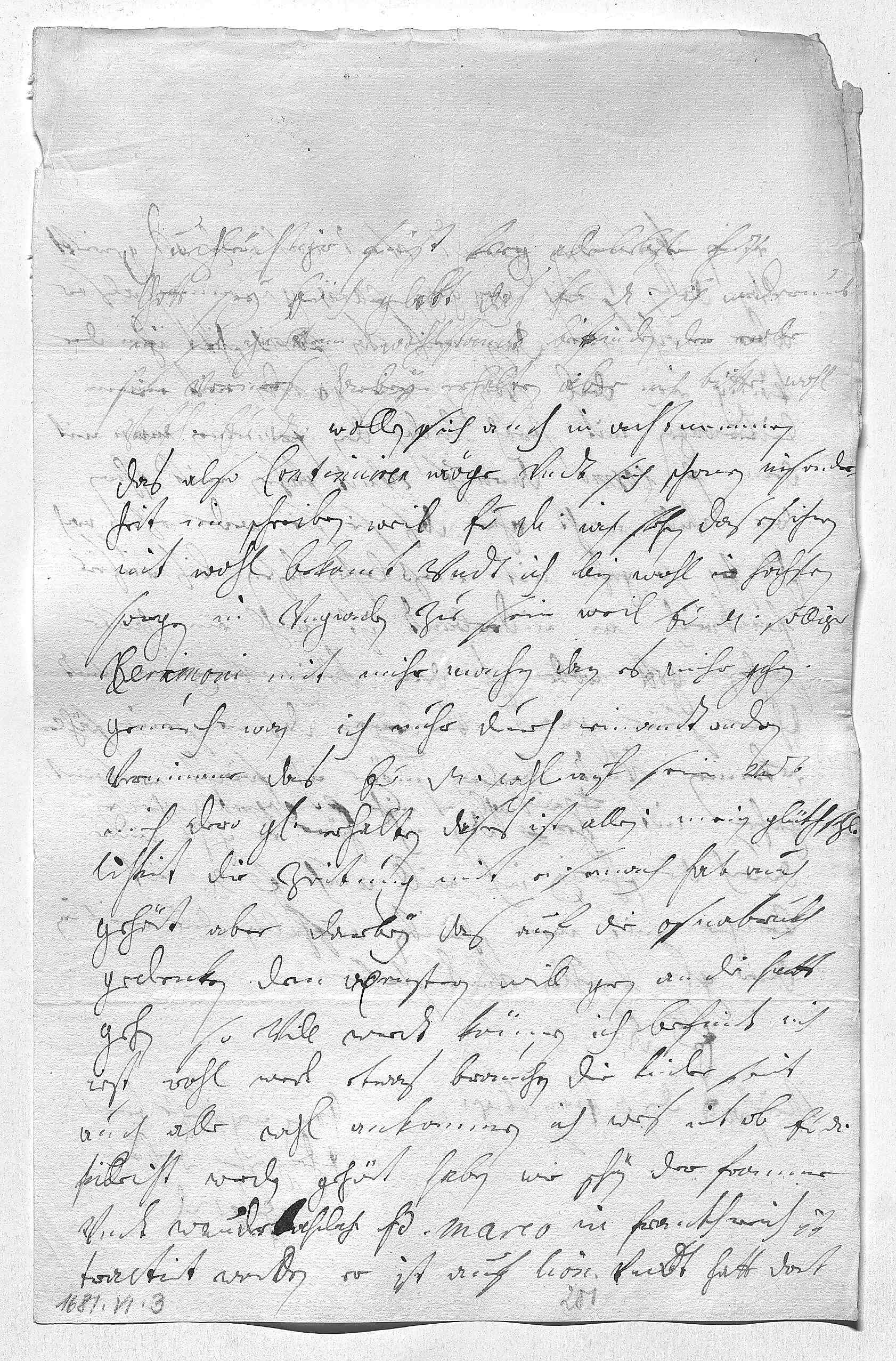0023einen krumpen geradt vndt noch mehr gnaden gewirkt, 0024von dorten sein weg gegen Paris genommen. Als er 0025aber noch ein dag reis von Paris, schikt ihm der 0026König ein deil von seiner guardi mit einem 0027leiterwagen mit stroh, laden den frommen man mit 0028dem Pater Cosmo darauf vndt fahren mit ihnen 0029dag vndt nacht, ohne das sie sie weder eßen noch 0030schlaffen, sogar nit meß lesen laßen, bis auser 0031Frankreich in Niderlandt . Ist wohl ein harte 0032sachen, gott wolle es dem König verzaien vndt 0033ihme seine gnadt verleyen, das er seine fähler 0034erkennen vndt beßern möge. Ich förcht, er komt 0035gahr nit her, wie wohl es mihr Pater Cosmo geschriben, dan ich höre, er geht wider 0036durch die Schweiz . Ich will auch ewer Durchlaucht nit 0037lenger mit mein schreiben aufhalten, due mich in 0038dero gnade befehlen vndt sterbe 0039ewer Durchlaucht 0040ganz ergebenste trew 0041gehorsamste dochter 0042EMT 0043Neüstatt den 3 junij 1681
