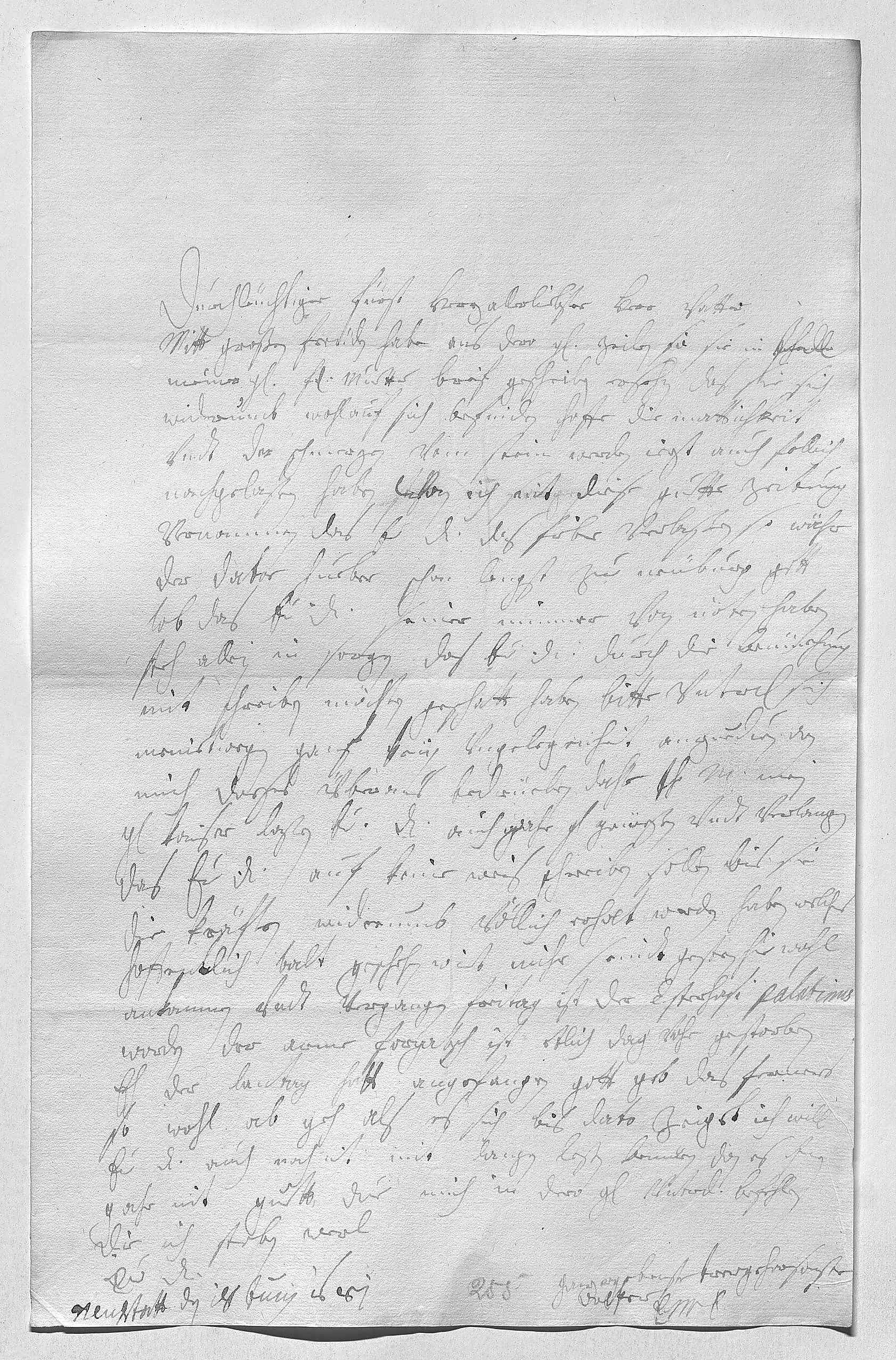 0001Durchleüchtiger Fürst, herzallerliebster herr vatter 0002Mitt großen freüden habe aus dero gnädigen zeilen, so sie in ihr Durchlaucht, 0003meiner geliebsten fraw muetter, brief geschriben, ersehn, das sie sich 0004widerumb wohlauf sich befinden. Hoffe, die mattichkeit 0005vndt der schmerzen vom stein werden iezt auch follich 0006nachgelaßen haben. Wan ich nit diese guette zeitung 0007vernommen, das ewer Durchlaucht das fieber verlaßen, so währe 0008der doctor Hueber schon lengst zue Neüburg, gott 0009lob, das ewer Durchlaucht seiner nimmer von nöten haben. 0010Steh allein in sorgen, das ewer Durchlaucht sich durch die bemüehung 0011mit schreiben möchten geschatt haben, bitte vnterdehnigst, sich 0012meinetwegen gans kein vngelegenheit anzueduen, dan 0013mich dieses überaus bedrüeben dahte. Ihr Mayestät, mein 0014 Kaiser, laßen ewer Durchlaucht auch gahr gnädig grüeßen vndt verlangen, 0015das ewer Durchlaucht auf keine weis schreiben sollen, bis sie 0016die kräften widerumb völlich erholt werden haben, welches 0017hofentlich balt geschehn wirt. Mihr seindt gestern hie wohl 0018ankommen, vndt vergangen freitag ist der Esterhasi Palatinus 0019worden. Der arme Forgatsch ist etlich dag vohr gestorben, 0020eh der lantag hatt angefangen. Gott geb, das ferners 0021so wohl ab geh als es sich bis dato zeiget. Ich will 0022ewer Durchlaucht auch noch nit mit langen leßen bemüen, dan es inen 0023gahr nit guett tut. Due mich in dero gnade vnterdehnigst befehlen, 0024die ich sterben werde 0025ewer Durchlaucht 0026ganzergebenste trewgehorsamste 0027dochter 0028EMT 0029Neustatt den 18 junij 1681