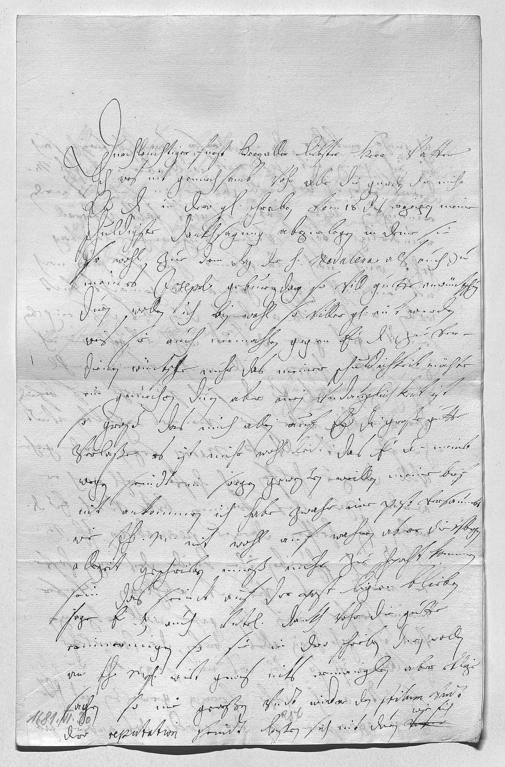 0001Durchleüchtiger Fürst, herzaller liebster herr vatter 0002Ich weis nit genuechsamb vohr alle die gnaden, die mihr 0003ewer Durchlaucht in dero gnädigen schreiben vom 18 dis erzeigen, meine 0004schuldigste dankhsagung abzuelegen, in deme sie 0005so wohl zue dem dag der heiligen Madalena als auch zue 0006meines Joseprl geburzdag so vill guette anwüntschung 0007duen wollen. Ich bin wohl so viller gnade nit werden, 0008weis sie auch niemahlen gegen ewer Durchlaucht zuever- 0009dienen. Wüntsche mihr, das meiner schuldichkeit möchte 0010ein genüechen duen, aber mein vndauglichkeit ist 0011so groß, das mich allein auf ewer Durchlaucht große güette 0012verlaße. Es ist mihr wohl leid, das ewer Durchlaucht meinet 0013wegen seindt in sorgen geweßen, weillen meine brif 0014nit ankommen. Ich habe zwahr eine post versaumbt 0015wie ihr Mayestät nit wohl auf wahren, aber die übrigen 0016allezeit geschrieben, mueß nuhr zue schpaht kommen 0017sein, das seindt auf der post ligen blieben. 0018Sage ewer Durchlaucht auch vnterdehnigsten dankh vohr die guette 0019erinnerungen, so sie in dero schreiben duen wollen, 0020an ihr Mayestät wirt gewis niks ermanglen, aber etlige 0021sachen, so nie geweßen vndt wider den stilum vndt 0022dero reputation seindt, laßen sich nit duen verner , wie ich