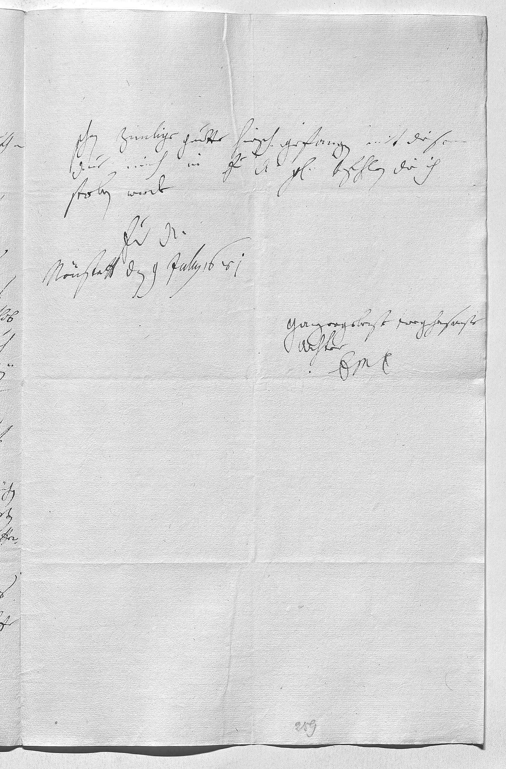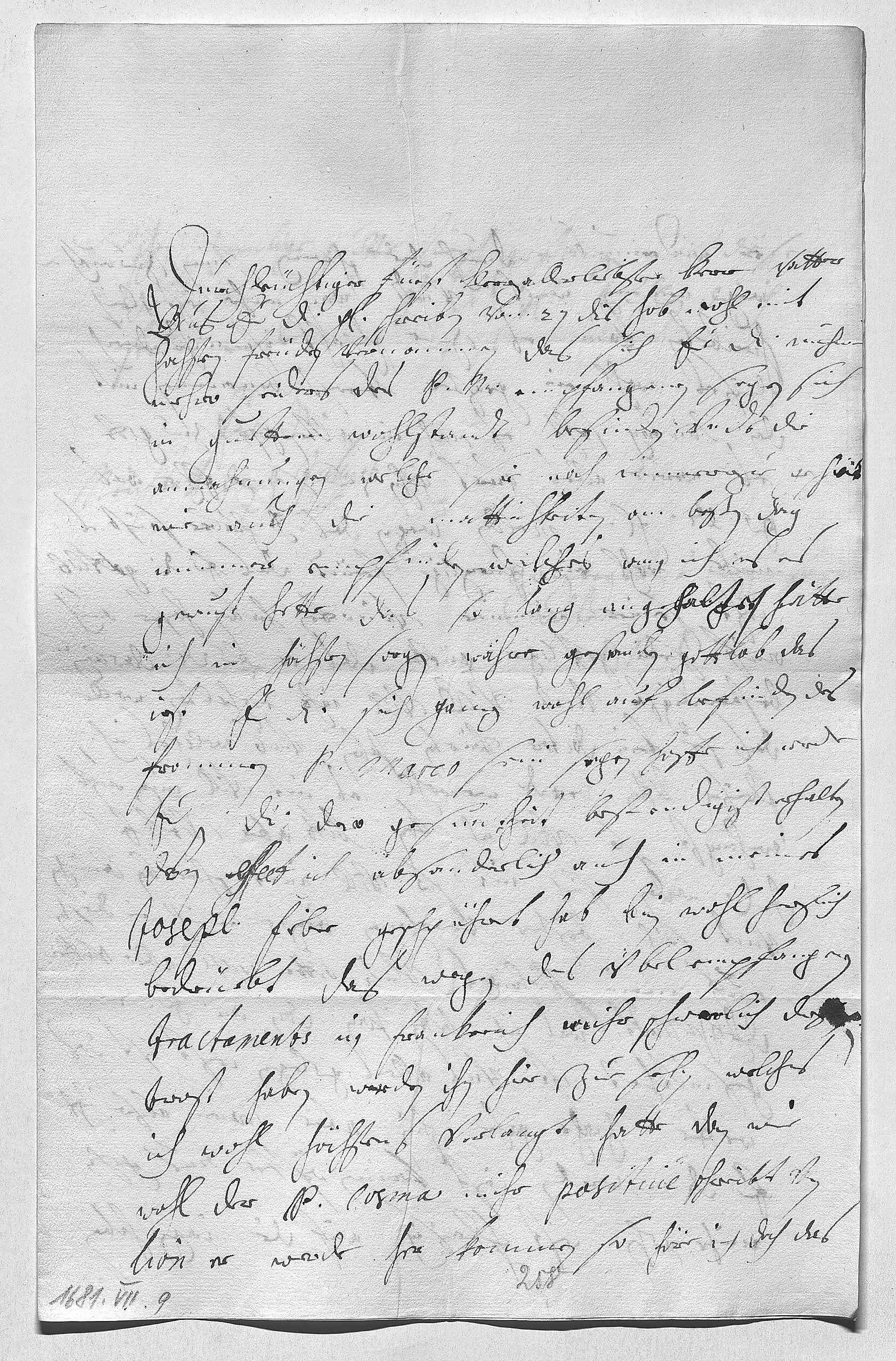 0001Durchleüchtiger Fürst, herzallerliebster herr vatter 0002Aus ewer Durchlaucht gnädigem schreiben vom 27 dis hab wohl mit 0003hochsten freüden vernommen, das sich ewer Durchlaucht nuhn- 0004mehro seiders des Pater Marco empfangenen segen sich 0005in guettem wohlstandt befinden vndt die 0006anmahnungen, welche sie noch immerzue geschiet, 0007wie auch die matichkeiten am beßen dag 0008nimmer empfinden, welches, wan ich es er 0009gewust hette, das so lang angehalten hätte, 0010ich in höchsten sorgen währe gestanden. Gottlob, das 0011izt ewer Durchlaucht sich ganz wohl auf befinden. Des 0012frommen Pater Marco sein segen, hoffe ich, werde 0013ewer Durchlaucht dero gesuntheit bestendigist erhalten, 0014den effect ich absonderlich auch in meines 0015Josepl fieber geschpühret hab. Bin wohl herzlich 0016bedrüebt, das wegen des übel empfangenen 0017tractaments in Frankreich mihr schwerlich diesen0018trost haben werden, ihn hier zue sehn, welches 0019ich wohl höchstens verlangt hatte. Dan wie 0020wohl der Pater Cosma mihr positiue schreibt von 0021Lion, er werde her kommen, so höre ich doch, das