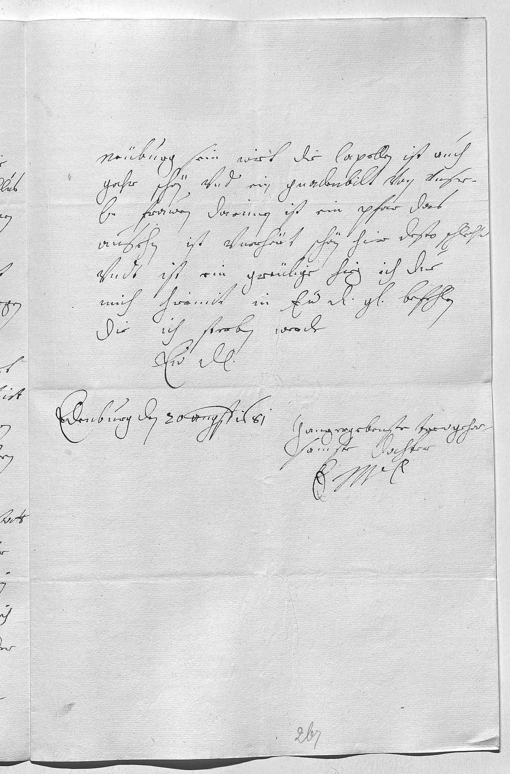 0039Neüburg sein wirt. Die capellen ist auch 0040gahr schön vnd ein gnadenbilt von vnser- 0041lieben frawen darinen, ist ein pfar. Das 0042ausehn ist vnerhört schön, hir desto schlechter 0043vndt ist ein greülige hiz. Ich due 0044mich hiermit in ewer Durchlaucht gnade befehlen, 0045die ich sterben werde 0046ewer Durchlaucht 0047ganzergebenste trewgehor- 0048samste dochter 0049EMT 0050Edenburg den 20 august 1681