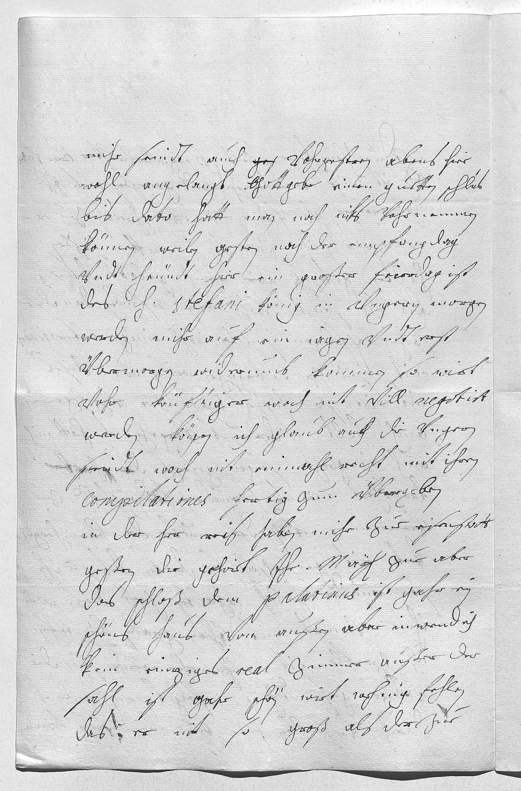 0020Mihr seindt auch ges vohrgestren abens hier 0021wohl angelangt, gott gebe einen guetten schlus. 0022Bis dato hatt man noch niks vohrnemmen 0023können, weilen gestren noch der empfangdag 0024vndt heündt hier ein großer feierdag ist 0025des heiligen Stefani, König in Vngern, morgen 0026werden mihr auf ein iagen vndt erst 0027übermorgen widerumb kommen. So wirt 0028vohr könftiger woch nit vill negotirt 0029werden könen. Ich glaub auch, die vngern 0030seindt noch nit einmahl recht mit ihren 0031compilationes fertig zum übergeben. 0032In der her reis haben mihr zue Eisenstatt 0033geßen, die gehört ihr Mayestät zue, aber 0034das schloß dem Palatinus . Ist gahr ein 0035schöns haus von außen, aber inwendich 0036kein einziges real zimmer, außer der 0037sahl ist gahr schön. Wirt wehnig fehlen, 0038das er nit so groß als der zue