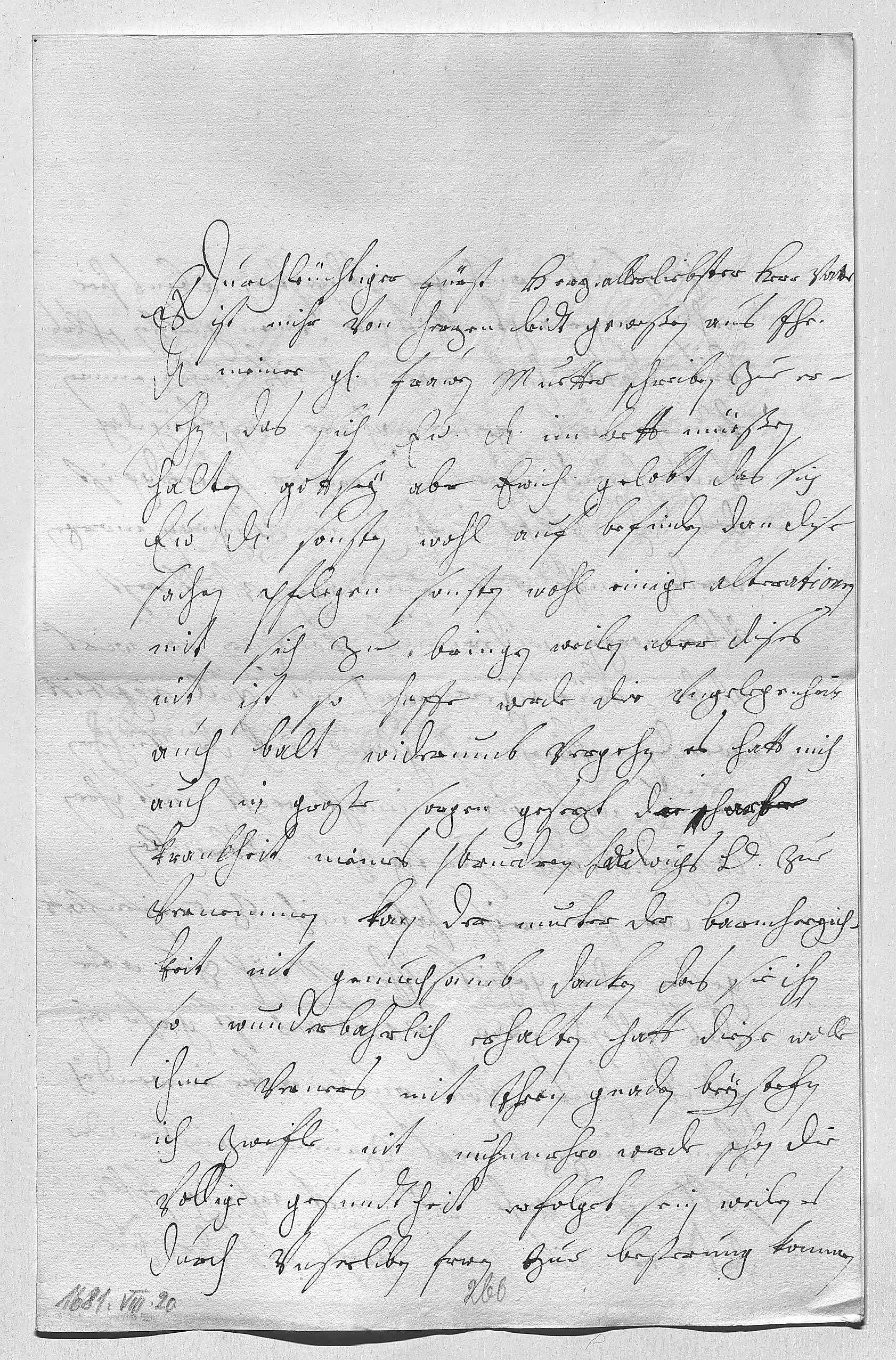 0001Durchleüchtiger Fürst, herzallerliebster herr vatter 0002Es ist mihr von herzen leidt geweßen, aus ihr 0003Durchlaucht, meiner geliebsten frawen muetter, schreiben zue er- 0004sehn, das sich ewer Durchlaucht im bett müeßen 0005halten. Gott sey aber ewich gelobt, das sich 0006ewer Durchlaucht sonsten wohl auf befinden, dan dise 0007sachen pflegen sonsten wohl einige alterationen 0008mit sich zue bringen. Weilen aber dises 0009nit ist, so hoffe, werde die vngelegenheit 0010auch balt widerumb vergehn. Es hatt mich 0011auch in große sorgen gesezt die scharfe 0012krankeit meines herrn bruedren Ludwigs Liebden zue 0013vernemmen. Kan der mueter der barmherzich- 0014keit nit genuechsamb danken, das sie ihn 0015so wunderbahrlich erhalten hatt, diese wolle 0016ihme verners mit ihren gnaden beystehn. 0017Ich zweifle nit, nuhnmehro werde schon die 0018vollige gesundtheit erfolget sein, weilen es 0019durch vnserliben frawen zue beßerung kommen.