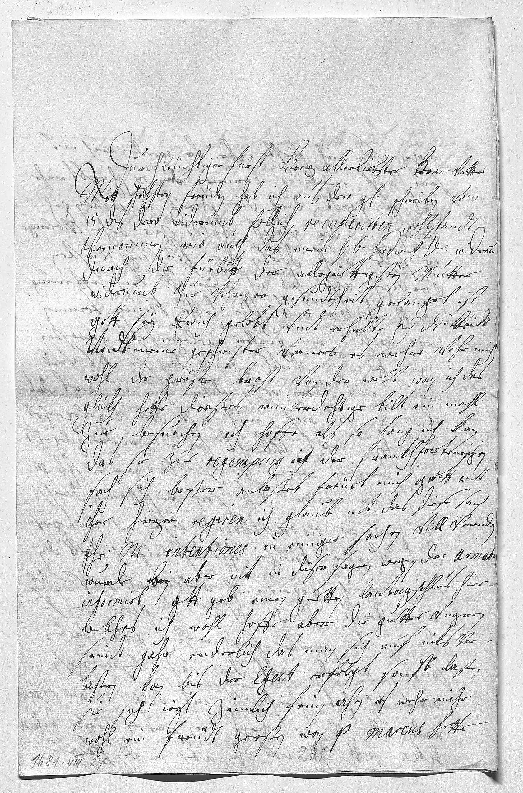 0001Durchleüchtiger Fürst, herz allerliebster herr vatter 0002Mitt höchsten freüden hab ich aus dero gnädigem schreiben vom 000315 dis dero widerumb follich recuperirten wohlstandt 0004vernommen, wie auch, das mein herr bruder Ludwich Liebden widerum0005durch die fürbitt der allergüettigisten muetter 0006widerumb zue vohriger gesundtheit gelanget ist, 0007gott sey ewich gelobt vndt erhalte ewer Durchlaucht beide 0008vndt meine geschwister verners. Es wehre vohr mich 0009wohl der gröste trost von der welt, wan ich das 0010glükh hette, dießes wunderdehtige bilt ein mahl 0011zue besuechen. Ich hoffe als so lang ich kan. 0012Das sie zue Regenspurg in der frankhforterischen 0013sach sich beßer anlaßet, freüet mich, gott wirt 0014ihre herzer regiren. Ich glaub nit, das diese sach 0015ihr Mayestät intentiones in einiger sachen vill verendern0016wurde, bin aber nit in diser sagen wegen der armatur0017informirt. Gott geb einen guetten lantagschlus hier, 0018welches ich wohl hoffe, aber die gutte vngren 0019seindt gahr enderlich, das man sich auf niks ver- 0020laßen kan, bis der efect erfolgt. Sonst laßen 0021sie sich iezt zimlich fein ahn. Es wehr mihr 0022wohl ein freüdt geweßen, wan Pater Marcus hette