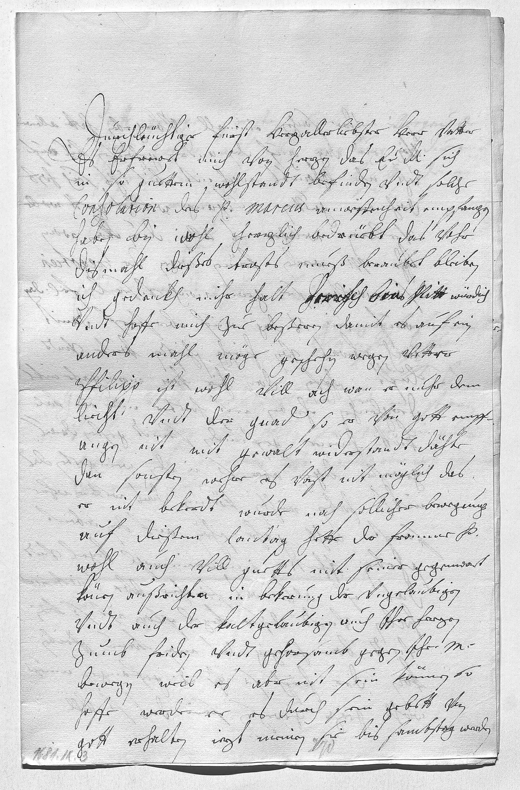 0001Durchleüchtiger Fürst, herzallerliebster herr vatter 0002Es erfrewet mich von herzen, das ewer Durchlaucht sich 0003in so guettem wohlstandt befinden vndt solche 0004consolation des Pater Marcus anweßenheit empfangen 0005haben. Bin wohl herzlich bedrüebt, das vohr 0006dismahl dießes trosts mueß beraubet bleiben. 0007Ich gedenkh mihr halt, herr, ich bins nitt würdich, 0008vndt hoffe mich zue beßeren, damit es auf ein 0009anders mahl möge geschehn. Wegen vetter 0010Pfilipp ist wohl vill, ach, wan er nuhr dem 0011liecht vndt der gnad, so er von gott empf- 0012angen, nit mit gewalt widerstandt dähte, 0013dan sonsten wehre es vast nit möglich, das 0014er nit bekerdt wurde nach sollicher bewegung. 0015Auf dießem lantag hette der fromme Pater 0016wohl auch vill guetts mit seiner gegenwart 0017könen außrichten in bekerung der vngelaubigen 0018vndt auch der kaltgelaubigen, auch ihre herzen 0019zumb friden vndt gehorsamb gegen ihr Mayestät 0020bewegen, weil es aber nit sein können, so 0021hoffe, werde er es durch sein gebett von 0022gott erhalten. Iezt meinen sie, bis sambstag werden
