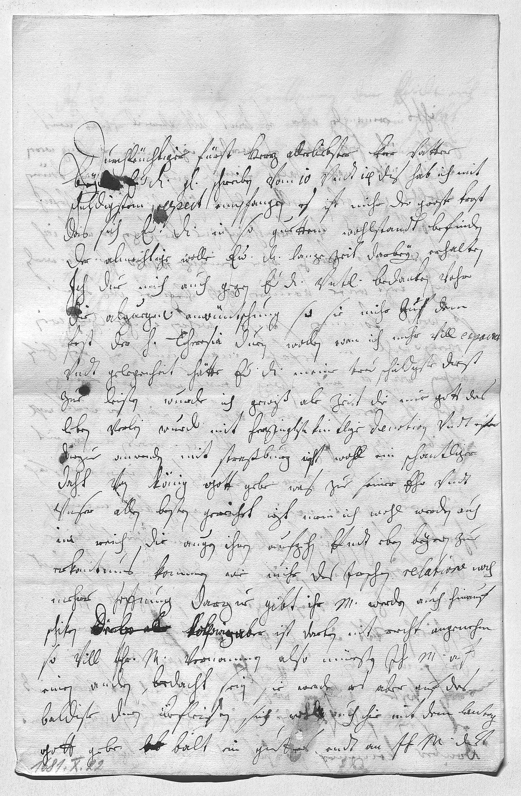 0001Durchleüchtiger Fürst, herz allerliebster herr vatter 0002Beyde ewer Durchlaucht gnädige schreiben vom 10 vndt 14 dis hab ich mit 0003schuldigstem respect empfangen. Es ist mihr der groste trost, 0004das sich ewer Durchlaucht in so guettem wohlstandt befinden, 0005der almechtige wolle ewer Durchlaucht lange zeit darbey erhalten. 0006Ich due mich auch gegen ewer Durchlaucht vnterdehnigst bedanken vohr 0007die allzugnädige anwüntschung, so sie mihr auf dem 0008fest der heiligen Theresia duen wollen. Wan ich nuhr vill capacitet 0009vndt gelegenheit hätte, ewer Durchlaucht meine trew schuldigste dienst 0010zue leisten, wurde ich gewiß ale zeit, die mir gott das 0011leben verleien wurd, mit herzinigliste kintlige deuotion vndt eifer 0012darzue anwenden. Mit Straßburg ist wohl ein schantliger 0013daht von König, gott gebe, was zue seiner ehr vndt 0014vnser allen besten gereichet. Iezt, mein ich wohl, werden auch 0015im Reich die augen ihnen aufgehn vndt eben Beyern zue 0016erkantnus kommen, wie mihr des Irschen relatione noch 0017mehrer hoffnung darzue gibt. Ihr Mayestät werden auch hinauf 0018schiken, der lo aber Lokowiz aber ist dorten nit recht angenehm, 0019so vill ihr Mayestät vernommen, also müeßen ihr Mayestät auf 0020einen andern bedacht sein. Sie werden es aber auf das 0021baldiste duen, befleisen sich wohl auch hie mit dem lantag, 0022gottt gebe bat balt ein guettes endt. An ihr Mayestät duet