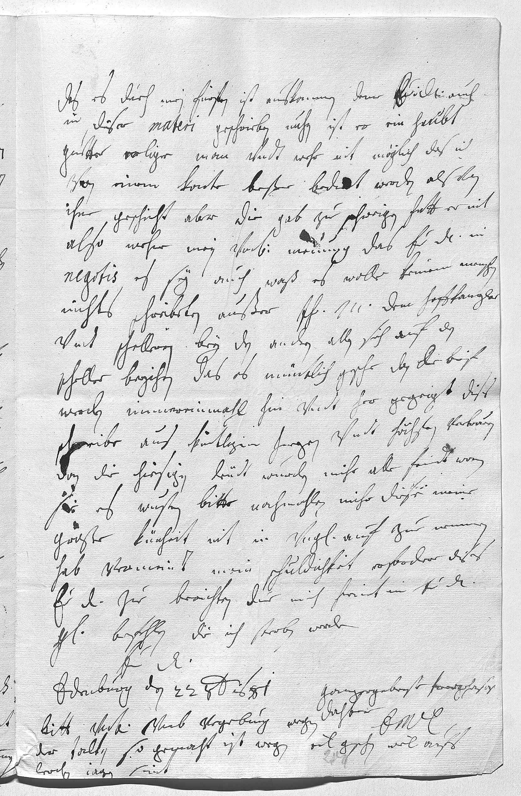 0045das es durch mein Fürsten ist auskommen, deme ewer Durchlaucht auch 0046in diser materi geschrieben. Nuhn ist er ein haubt 0047guetter erliger man vndt wehr nit möglich, das ich 0048von einem konte beßer bedient werden als von 0049ihme geschicht, aber die gab zue schweigen hatt er nit. 0050Also wehre mein vnterdehnigste meinung, das ewer Durchlaucht in 0051negotis, es sey auch waß es wolle, keinem menschen 0052nichts schreibeten außer ihr Mayestät, dem Hoffkanzler 0053vndt Schelleren, bey den andern allen sich auf den 0054Scheller bezihen, das es müntlich gesche, dan die brif 0055werden immereinmahl hin vndt her gezeigt. Dises 0056schreibe aus kintligem herzen vndt höchsten vertrawen, 0057dan die hiesigen leüdt wurden mihr alle feindt, wann 0058sie es wusten. Bitte nochmahlen, mihr diese meine 0059große künheit nit in vngnaden auf zue nemmen, 0060hab vermeindt, mein schuldichkeit erfordere, dises 0061ewer Durchlaucht zue berichten. Due mich hirmit in ewer Durchlaucht 0062gnade befehlen, die ich sterben werde 0063ewer Durchlaucht 0064ganzergebenste trewgehorsamst 0065dochter 0066EMT 0067Edenburg den 22 octobris 16810068Bitt vnterdehnigst vmb vergebung wegen 0069der falten, so gemacht, ist wegen eil geschen, weil aufs 0070lerchen iagen seint.