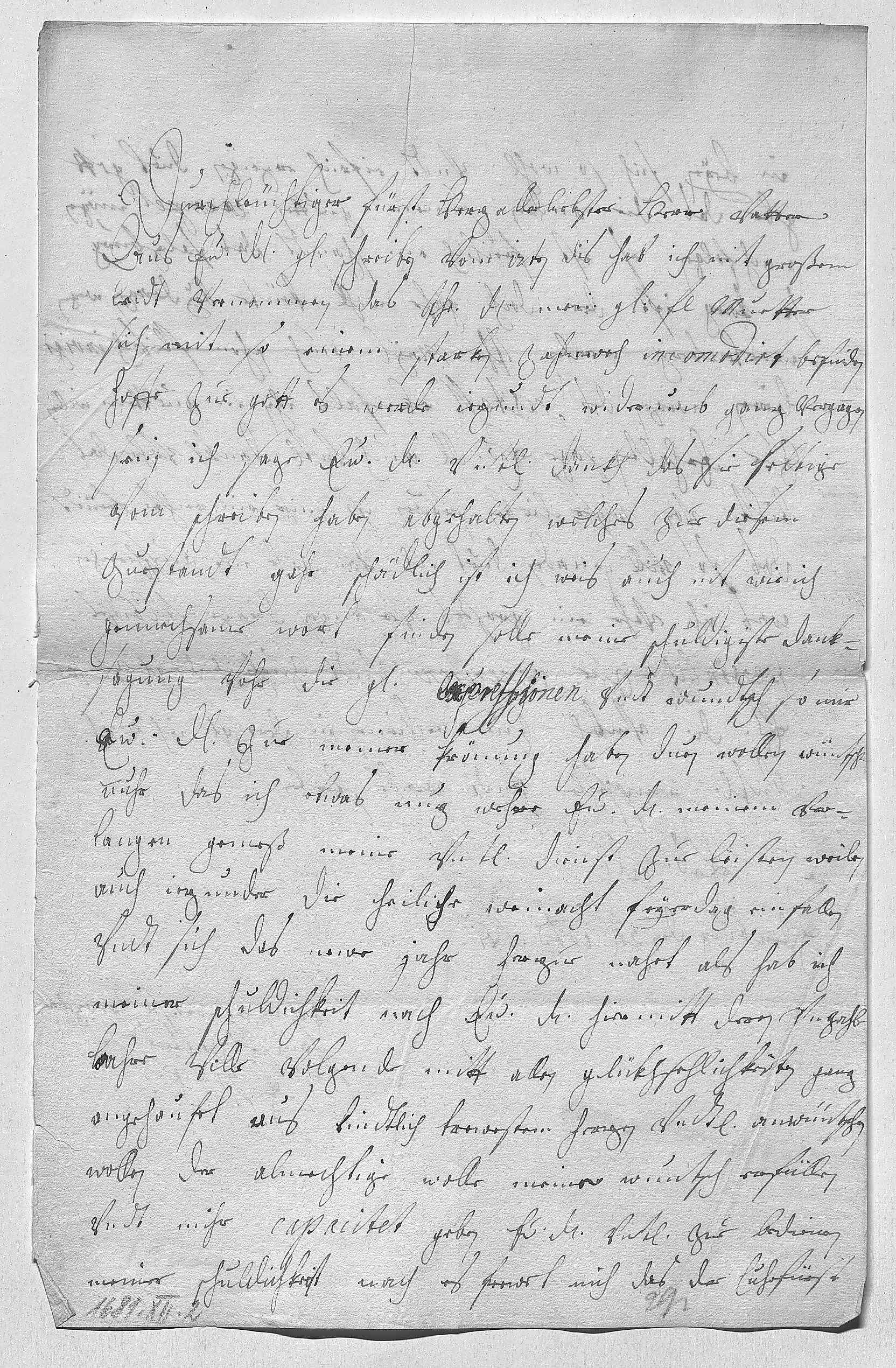0001Durchleüchtiger Fürst herz allerliebster herr vatter 0002Aus ewer Durchlaucht gnädigem schreiben vom 17ten dis hab ich mit großem 0003leidt vernommen, das ihr Durchlaucht, mein geliebste fraw muetter, 0004sich mit so einem starken zahnweh incomodirt befinden. 0005Hoffe zue gott, es werde iezundt widerumb ganz vergangen 0006sein. Ich sage ewer Durchlaucht vnterdehnigsten dankh, das sie selbige 0007vom schreiben haben abgehalten, welches zue diesem 0008zuestandt gahr schädlich ist. Ich weis auch nit, wie ich 0009genuechsame wort finden solle, meine schuldigiste dank- 0010sagung vohr die gnädigen expressionen vndt wundtsch auszudrücken, so mir 0011ewer Durchlaucht zue meiner krönung haben duen wollen. Wüntsche 0012nuhr, das ich etwas nuz wehre, ewer Durchlaucht meinem ver- 0013langen gemeß meine vnterdehnigste dienst zue leisten. Weilen 0014auch iezunder die heilige weinacht feyerdag einfallen 0015vndt sich das newe jahr herzue nahet, als hab ich 0016meiner schuldichkeit nach ewer Durchlaucht hiermitt deren vnzahl- 0017bahre ville volgende mitt allen glükhsehlichkeiten ganz 0018angehaufet aus kindtlich trewestem herzen vnterdehnigst anwüntschen 0019wollen. Der almechtige wolle meine wuntsch erfüllen 0020vndt mihr capacitet geben, ewer Durchlaucht vnterdehnigst zue bedienen 0021meiner schuldichkeit nach. Es frewet mich, das der Cuhrfürst