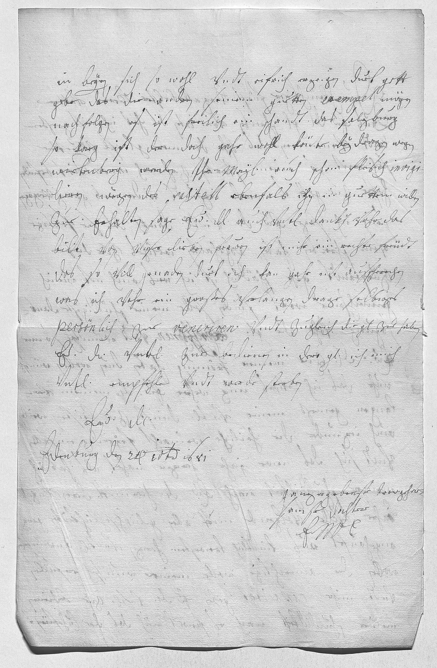 0022in Beyrn sich so wohl vndt eifrich erzeigen duet, gott 0023gebe, das die andren seinem guetten exempel mögen 0024nachfolgen. Es ist freilich ein schandt, das Salzburg 0025so karg ist, der doch gahr wohl könte beydragen. Wegen 0026Wirtenberg werden ihr Mayestät auch schon fleisich invigi- 0027lieren, wegen des Castell ebenfals, ihn in guettem willen 0028zue erhalten. Sage ewer Durchlaucht auch vnterdehnigsten dankh vohr das 0029bilt von vnser lieben frawen, ist mihr ein rechte freüdt, 0030das so vill genaden duet. Ich kan gahr nit ausschprechen, 0031was ich vohr ein großes verlangen drage, selbiges 0032persönlich zue veneriren vndt zugleich die gnade zue haben, 0033ewer Durchlaucht vnterdehnigst zue bedienen, in dero gnade ich mich 0034vnterdehnigst empfehle, vndt werde sterben 0035ewer Durchlaucht 0036ganz ergebenste trewgehor- 0037samste dochter 0038EMT 0039Edenburg den 2ten decembris 1681