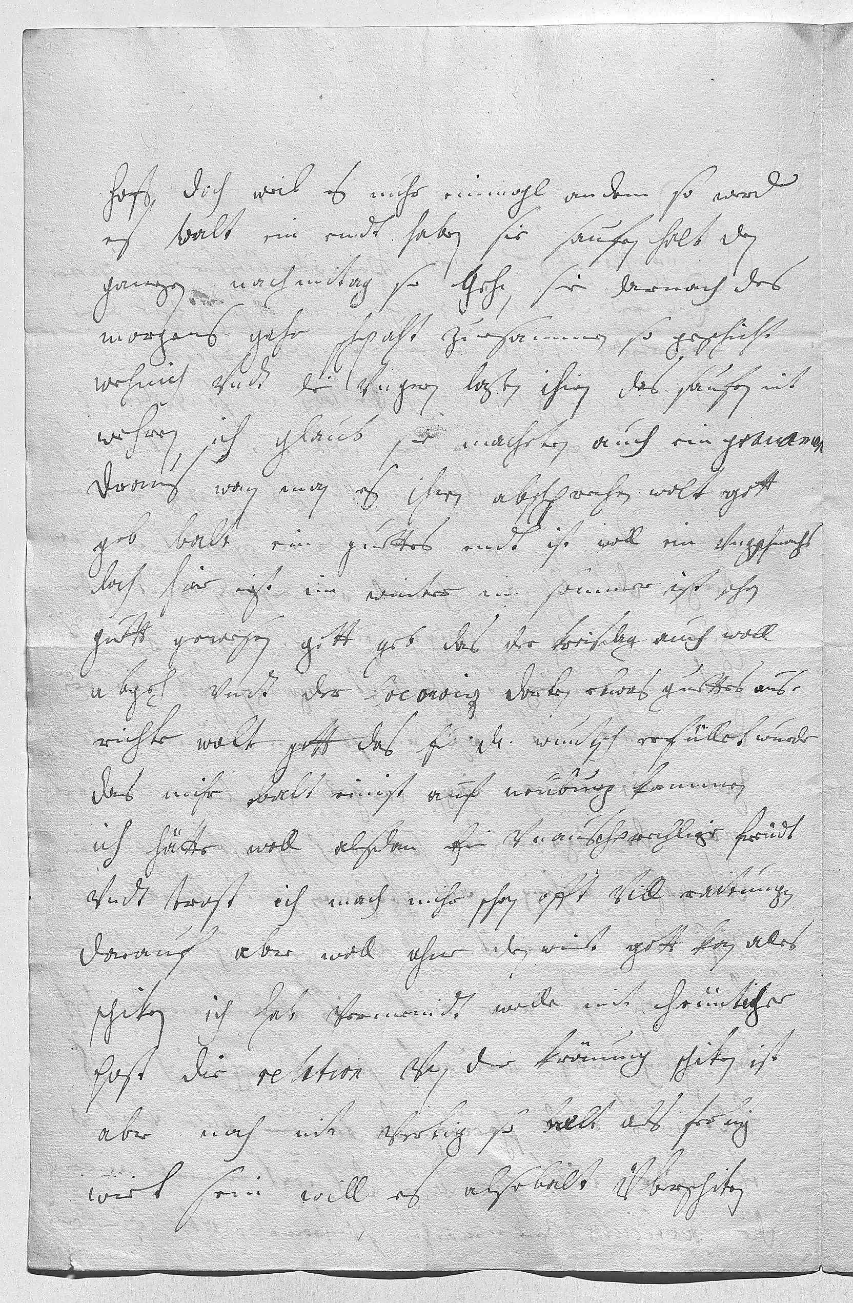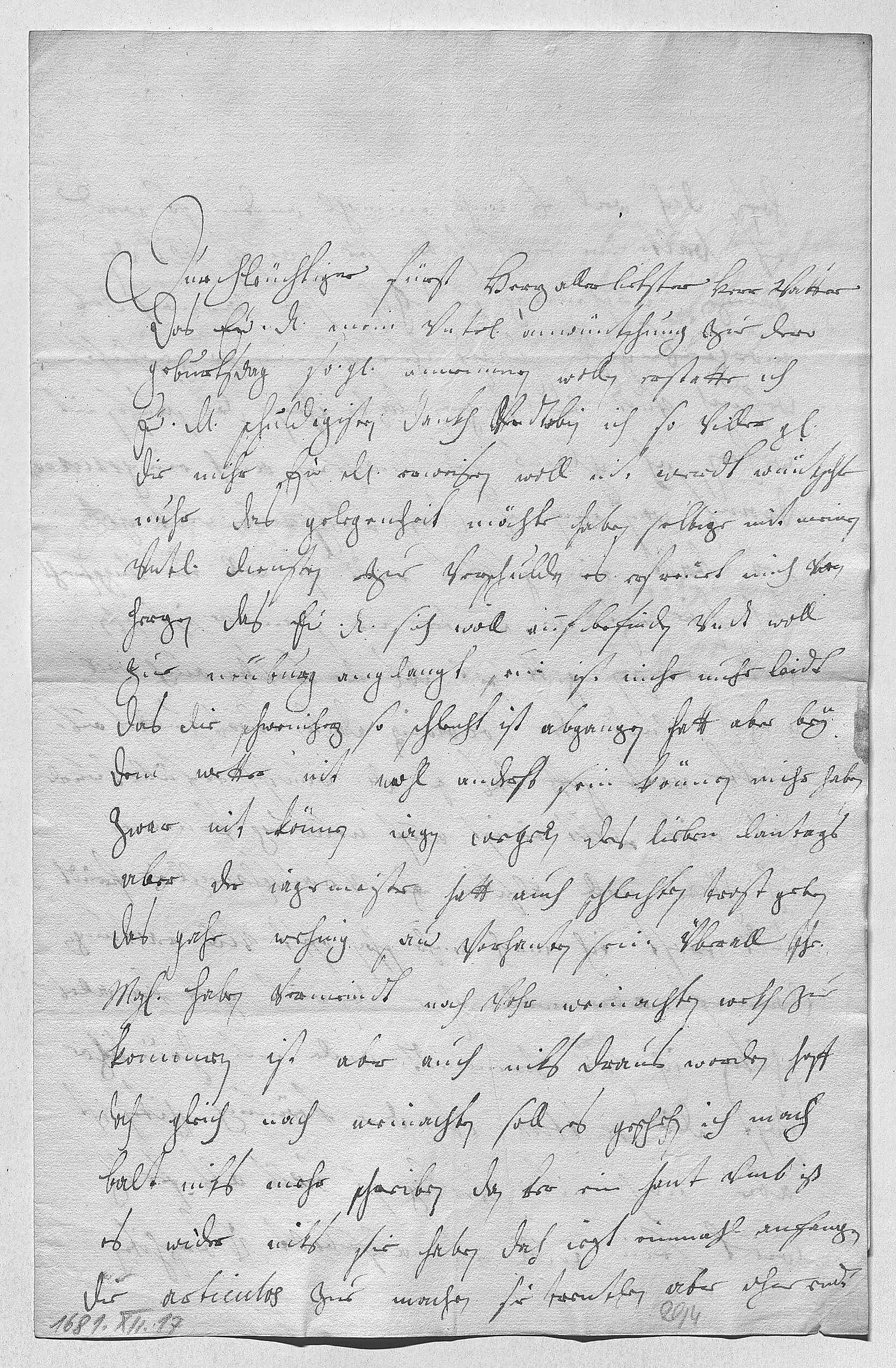 0001Durchleüchtiger Fürst, herzallerliebster herr vatter 0002Das ewer Durchlaucht mein vnterdehnigste anwüntschung zue dero 0003geburtsdag so gnädig annemmen wollen, erstatte ich 0004ewer Durchlaucht schuldigisten dankh vndt bin ich so viller gnade, 0005die mihr ewer Durchlaucht erweisen, woll nit werdt. Wüntschte 0006nuhr, das gelegenheit möchte haben, selbige mit meinen 0007vnterdehnigsten diensten zue verschulden. Es erfreuet mich von 0008herzen, das ewer Durchlaucht sich woll auf befinden vndt woll 0009zue Neüburg anglangt sein. Ist mihr nuhr leidt, 0010das die schweinhez so schlecht ist abgangen, hatt aber bey 0011dem wetter nit wohl anderst sein können. Mihr haben 0012zwar nit können iagen wegen des lieben lantags, 0013aber der Iagrmeister hatt auch schlechten trost geben, 0014das gahr wehnig saw vorhanten sein überall. Ihr 0015Mayestät haben vermeindt, noch vohr weinachten wekh zue 0016kommen, ist aber auch niks draus worden. Hoff 0017doch, gleich nach weinachten soll es geschehn, ich mach 0018balt niks mehr schreiben, dan ker ich ein hant vmb, ist 0019es wider niks. Sie haben doch iezt einmahl anfangen 0020die articulos zue machen, sie trentlen aber ohne endt,