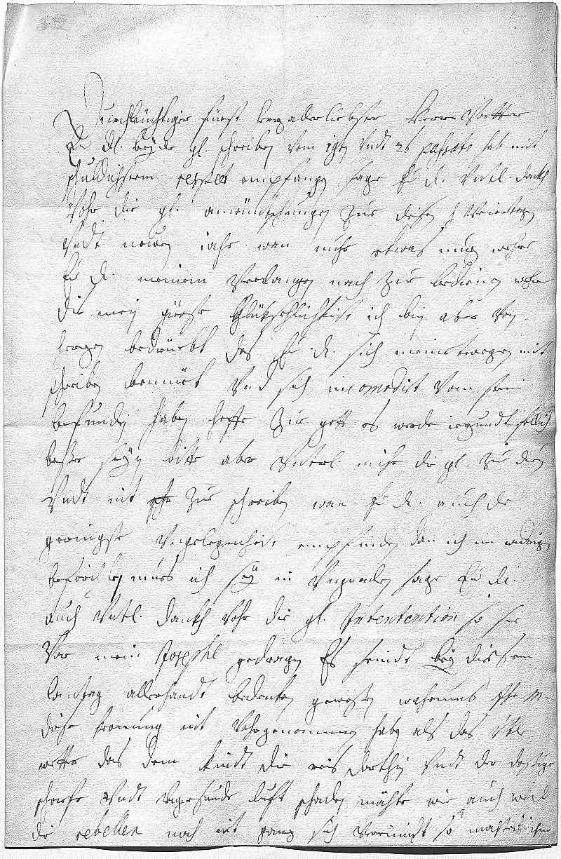 0001Durchleüchtiger Fürst, herz allerliebster herr vatter 0002Ewer Durchlaucht beyde gnädigste schreiben vom 19ten vndt 26 passato hab mit 0003schuldichstem respect empfangen. Sage ewer Durchlaucht vnterthenigsten dankh 0004vohr die gnädigen anwüntschungen zue diesen heiligen veiertagen 0005vndt newen iahr. Wan ich nuhr etwas nuz wehre, 0006ewer Durchlaucht meinem verlangen nach zue bedienen, wehre 0007dis mein gröste glüksehlichkeit. Ich bin aber von 0008herzen bedrüebt, das euer Durchlaucht sich meinetwegen mit 0009schreiben bemüet vnd sich incomedirt vom stein 0010befunden haben, hoffe zue gott, es werde iezundt follich 0011beßer seyn. Bitte aber vnterdehnigst, mihr die gnade zue duen 0012vndt nit schr zue schreiben, wan ewer Durchlaucht auch die 0013geringste vngelegenheit empfinden, dan ich im widrigen 0014beförchten mues, ich sey in vngnaden. Sage ewer Durchlaucht 0015auch vnterdehnigsten dankh vohr die gnädige intentention, so sie 0016vber mein Josephl gedragen. Es seindt bey diesem 0017lantag allerhandt bedenken geweßen, wahrumb ihr Mayestät 0018dise kronung nit vohrgenommen haben, als das üble 0019wetter, das dem kindt die reis dorthin vndt der daßige 0020scharfe vndt vngesunde luft schaden möchte, wie auch weil 0021die rebellen noch nit ganz sich vereinicht, so mochtens in im