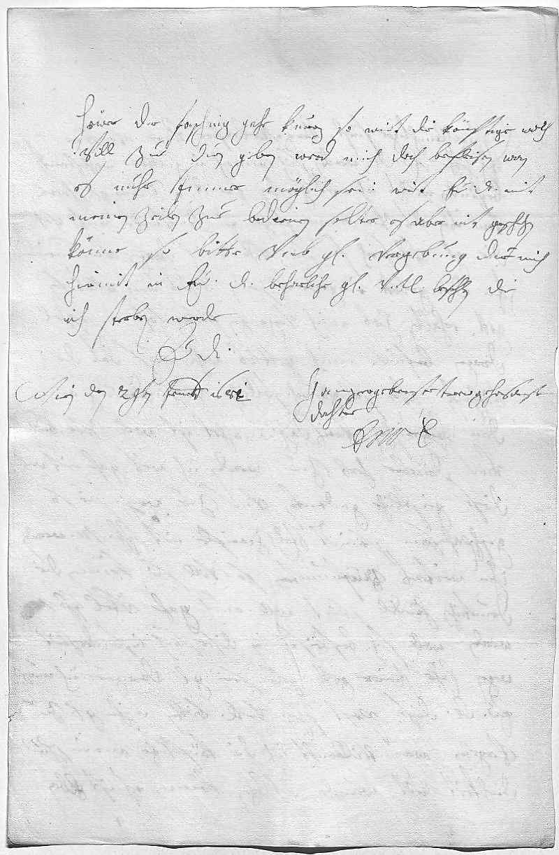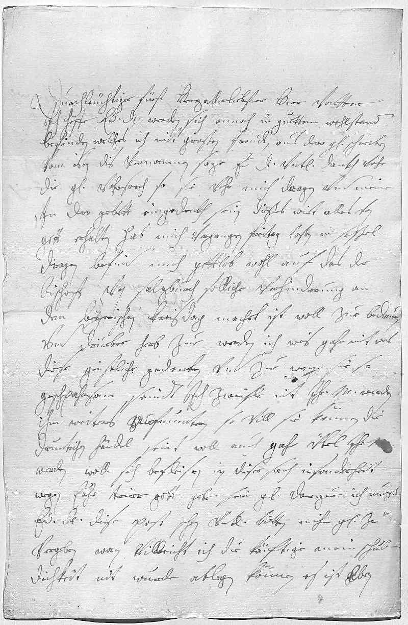 0001Durchleüchtiger Fürst, herz allerliebster herr vatter 0002Ich hoffe, ewer Durchlaucht werden sich annoch in guettem wohlstand 0003befinden, welches ich mit großen freüden aus dero gnädigstem schreiben 0004vom 16ten dis vernommen. Sage ewer Durchlaucht vnterdehnigsten dankh vohr 0005die gnädige vohrsorch, so sie vohr mich dragen, vnd dass sie meiner 0006in dero gebett eingedenkh sein. Dießes wirt alles von 0007gott erhalten. Hab mich vergangen freitag laßen in seßel 0008dragen, befind mich gottlob wohl auf. Das der 0009Bischoff von Salzburch solliche verhinderung an 0010dem beyerischen kreisdag machet, ist woll zue bedauren 0011vnd drüeber herb zue werden. Ich weis gahr nit, was 0012diese geistliche gedenken vnd zue wegen sie so 0013geschpahrsam seindt. Ich zweifle nit, ihr Mayestät werden 0014ihm weiters aufmuntern, so vill sie können. Die 0015druntichen händel seint woll auch gahr übel, ihr Mayestät 0016werden woll sich befleisen in diser sach, insonderheit 0017wegen Cuhr Trier, gott gebe sein gnade darzue. Ich mueß 0018ewer Durchlaucht dise post schon vnterdehnigst bitten, mihr gnädigst zu 0019vergeben, wan villeicht ich die könftige post mein schul- 0020dichkeit nit wurde ablegen können. Es ist eben