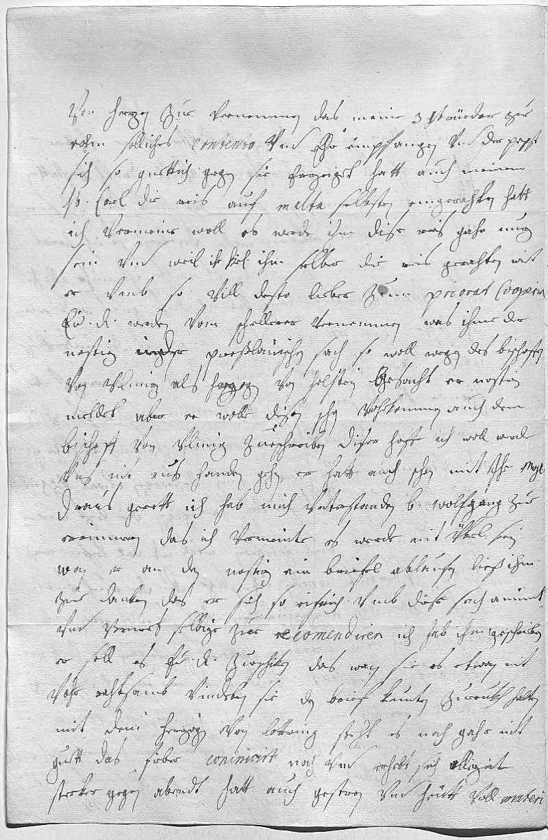 0021von herzen zue vernemmen, das meine 3 herren brüeder zue 0022Rohm solliches contento vnd ehr empfangen vnd der Papst 0023sich so guettich gegen sie erzeiget hatt, auch meinem 0024herrn bruder Carl die reis auf Malta selbsten eingerahten hatt. 0025Ich vermeine woll, es werde ihm dise reis gahr nuz 0026sein, vnd weil ihr Heiligkeit ihm selber die reis gerahten, wirt 0027er vmb so vill desto lieber zum priorat cooperirn. 0028Ewer Durchlaucht werden vom Schellerer vernemmen, was ihme der 0029Nostiz in der preßlauischen sach so woll wegen des Bischoffen 0030von Vlmiz als Herzogen von Holstein gesacht. Er, Nostiz, 0031meldet aber, er wolle disen schon vohrkommen, auch dem 0032Bischoff von Vlmiz zueschreiben. Diser, hoffe ich woll, werde 0033vns nit aus handen gehn, er hatt auch schon mit ihr Mayestät 0034draus gerett. Ich hab mich vnterstanden, bruder Wolfgang zue 0035erinnern, das ich vermeinte, es werde nit übel sein, 0036wan er an den Nostiz ein briefel ablaufen ließ, ihm 0037zue danken, das er sich so eifrich vmb diese sach annimt 0038vnd verners selbige zue recomendiren. Ich hab ihm geschrieben, 0039er soll es ewer Durchlaucht zueschiken, das, wan sie es etwan nit 0040vohr rahtsamb vindeten, sie den brief kunten zuruckh halten. 0041Mit dem Herzogen von Lottring steht es noch gahr nit 0042guett, das fieber continuirt noch vnd erhebt sich allezeit 0043sterker gegen abendt. Hatt auch gestren vnd heütt voll materi
