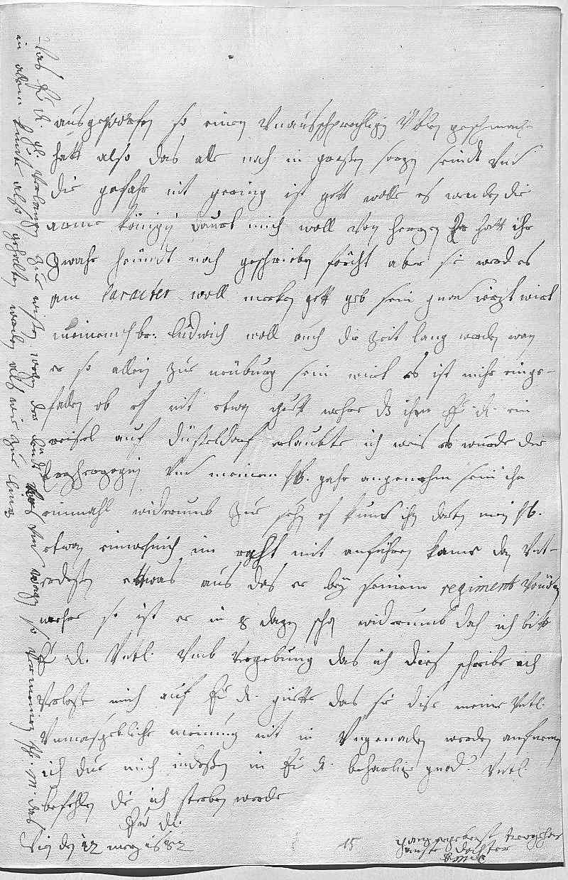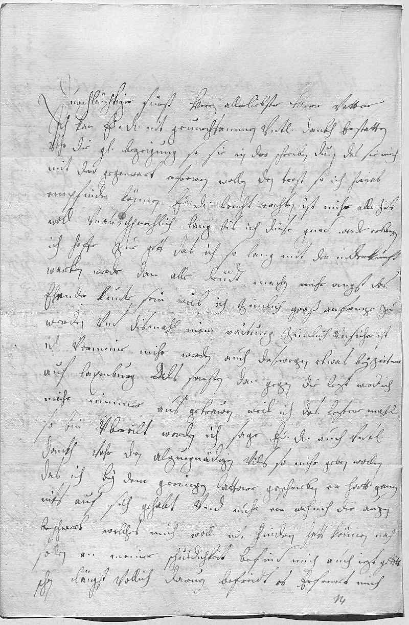 0001Durchleüchtiger Fürst, herz allerliebster herr vatter 0002Ich kan ewer Durchlaucht nit genuechsammen vnterdehnigsten dankh erstatten 0003vohr die gnädige bezeigung, so sie in dero schreiben duen, das sie mich 0004mit dero gegenwart erfrewen wollen. Den trost, so ich hierab 0005empfinde, können ewer Durchlaucht leicht erachten, ist mihr alle zeit 0006woll vnauschprechlich lang, bis ich diese gnad werde erlangen. 0007Ich hoffe zue gott, das ich so lang mit der niderkunft 0008warten werde, dan alle leüdt machen mihr angst, das 0009ehender kunte sein, weil ich zimlich groß anfange zu 0010werden vnd dismahl mein raitung zimlich vnsicher ist. 0011Ich vermeine, mihr werden auch deswegen etwas beyzeitner 0012auf Laxenburg als sonsten, dan gegen die lezt werd ich 0013mihr nimmer aus getrawen, weil ich das leztere mahl 0014so bin übereilt worden. Ich sage ewer Durchlaucht auch vnterdehnigsten 0015dankh vohr den alzuegnädigen vils, so mihr geben wollen, 0016das ich bey dem geringen cattare geschrieben. Er hatt ganz 0017niks auf sich gehabt vnd nuhr ein wehnich die augen 0018beschwert, welches mich woll nit hindren hatt können noch 0019sollen an meiner schuldichkeit. Befind mich auch iezt gottlob 0020schon längst vollich daruon befreidt. Es erfrewet mich