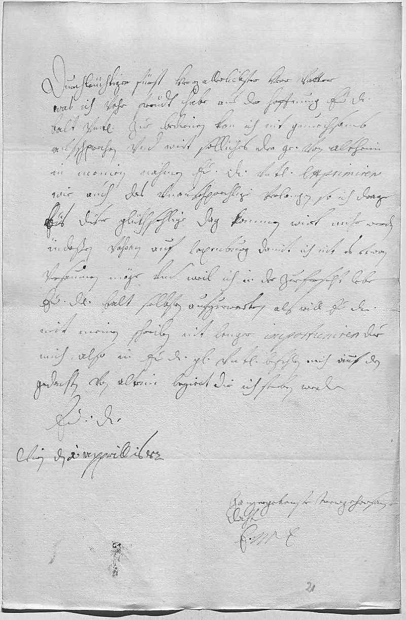 0001Durchleüchtiger Fürst, herz allerliebster herr vatter 0002Was ich vohr freüdt habe aus der hoffnung, ewer Durchlaucht 0003balt vnterdehnigst zue bedienen, kan ich nit gnuechsamb 0004auschprechen vnd wirt solliches der Graf von Altheim 0005in meinen nahmen ewer Durchlaucht vnterdehnigst exprimiren, 0006wie auch das vnauschprechlige verlangen, so ich drage, 0007bis diser glükhsehlige dag kommen wirt. Mihr werden 0008indeßen vohran auf Laxenburg, damit ich nit es etwan 0009versaumen möge. Vnd weil ich in der zuefersicht lebe, 0010ewer Durchlaucht balt selbsten aufzuewarten, als will ewer Durchlaucht 0011mit meinen schreiben nit lenger importuniren, due 0012mich also in ewer Durchlaucht gnade vnterdehnigst befehlen, mich auf den 0013gedachten von Alteim bezient, die ich sterben werde 0014ewer Durchlaucht 0015ganzergebenste trewgehorsamste 0016dochter 0017EMT 0018Wien den 1 apprill 1682