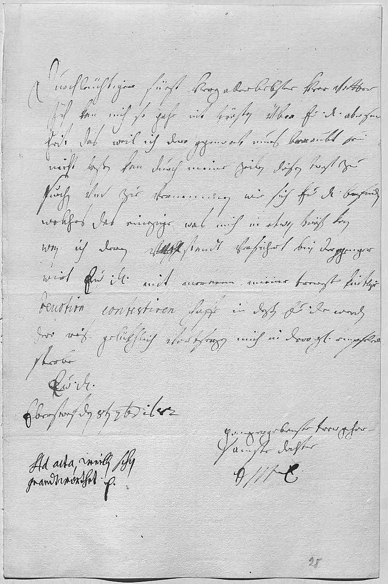 0001Durchleüchtiger Fürst, herz allerliebster herr vatter 0002Ich kan mich so gahr nit trösten über ewer Durchlaucht abwesen- 0003heit, das, weil ich dero gegenwart mues beraubt sein, 0004nicht laßen kan, durch meine zeilen diesen trost zue 0005suechen vnd zue vernemmen, wie sich ewer Durchlaucht befinden, 0006welches das einzige, was mich in etwan trösten kan, 0007wan ich deren wohlstandt versichert bin. Der Pater Genger 0008wirt ewer Durchlaucht mit mererem meine trewest kintlige 0009deuotion contestiren. Hoffe in deßen, ewer Durchlaucht werden 0010dero reis gelükhlich vortsezen, mich in dero gnade empfelend 0011sterbe 0012ewer Durchlaucht 0013ganzergebenste trewgehor- 0014amste dochter 0015EMT 0016Eberstorf den 8ten septembris 16820017ad acta, weillen schon0018geandtworthet p.