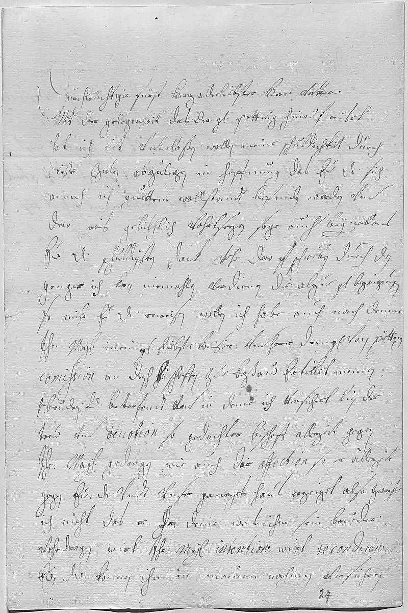 0001Durchleüchtiger Fürst, herz allerliebster herr vatter 0002Mit der gelegenheit, das der Grav Petting hinauf reiset, 0003hab ich nit vnterlaßen wollen, meine schuldichkeit durch 0004diese zeilen abzulegen in hoffnung, das ewer Durchlaucht sich 0005annoch in guettem wollstandt befinden werden vnd 0006dero reis gelükhlich vohrtsezen. Sage auch bey nebens 0007ewer Durchlaucht schuldigsten dank vohr dero gnädiges schreiben durch den 0008Genger . Ich kan niemahlen verdienen die alzue gnädigen bezeigungen, 0009so mihr ewer Durchlaucht erweisen wollen. Ich habe auch, nach demme 0010ihr Mayestät, mein gnädigster liebster Kaiser vnd herr, dem Grafen von Pötting 0011comission an den herrn Bischoffen zue Baßau erteilet, meinen 0012herrn brudern Liebden betrefendt, vnd in deme ich versichert bin der 0013trew vnd deuotion, so gedachter Bischoff allezeit gegen 0014ihr Mayestät gedragen, wie auch der affection, so er allezeit 0015gegen ewer Durchlaucht vndt vnser ganzes haus erzeiget, also zweifle 0016ich nicht, das er an deme, was ihm sein brueder 0017vohrdragen wirt, ihr Mayestät intention wirt secondiren. 0018Ewer Durchlaucht können ihn in meinem nahmen versichern,
