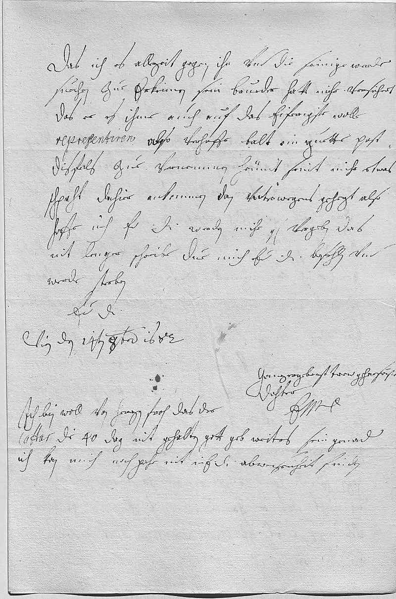 0019das ich es allezeit gegen ihn vnd die seinige werde 0020suechen zue erkennen. Sein brueder hatt mihr versichert, 0021das er es ihme auch auf das eiferigste wolle 0022representiren, also verhoffe balt ein guette post 0023disfals zue vernemmen. Heündt seint mihr etwas 0024schpaht dahier ankommen, dan wir vnterwegens gehezt, also 0025hoffe ich, ewer Durchlaucht werden mihr gnädigst vergeben, das 0026nit lenger schreibe. Due mich ewer Durchlaucht befehlen vnd 0027werde sterben 0028ewer Durchlaucht 0029ganzergebenst trew gehorsamste 0030dochter 0031EMT 0032Wien den 14ten oktober 16820033Ich bin woll von herzen froh, das der 0034cattar die 40 dag nit gehalten, gott geb weiters sein genad. 0035Ich kan mich noch gahr nit in ewer Durchlaucht abweesenheit finden.