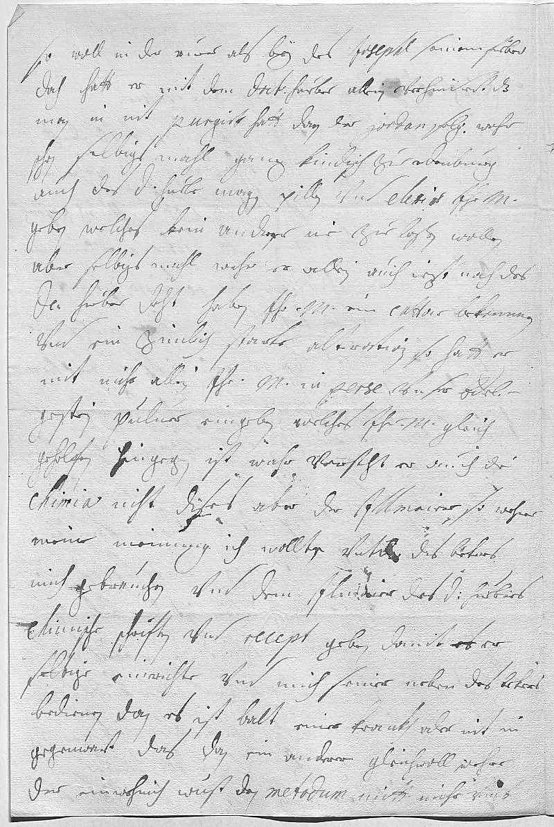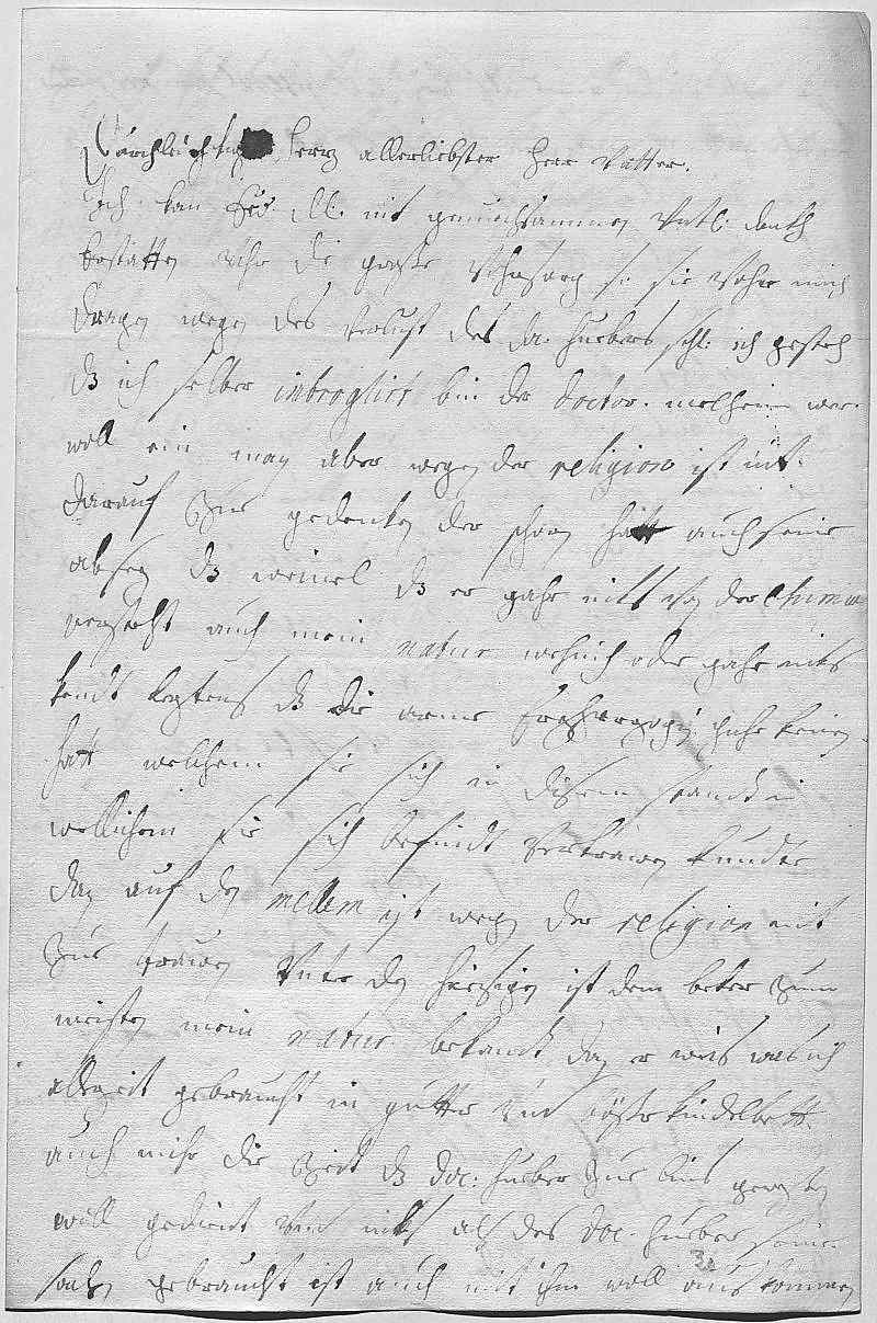 0001Durchleüchtiger herz allerliebster herr vatter 0002Ich kan ewer Durchlaucht nit genuechsammen vnterdehnigsten dankh 0003erstatten vohr die große vohrsorg, so sie vohr mich 0004dragen wegen des verlust des Doktor Huebers sehligen . Ich gesteh, 0005das ich selber imbroglirt bin. Der Doctor Melheim wer 0006woll ein man, aber wegen der religion ist nit 0007darauf zue gedenken. Der Schorn hatt auch seine 0008absez, das weinel, das er gahr niks von der chimia 0009versteht, auch mein natur wehnich oder gahr niks 0010kendt. Leztens, das die arme Erzherzogin gahr keinen 0011hatt, welchem sie sich in disem standt, in 0012wellichem sie sich befindt, vertrawen kundte, 0013dan auf den Mellem ist wegen der religion nit 0014zue trawen. Vnter den hiesigen ist dem Beker zum 0015meisten mein natur bekant, das er weis, was ich 0016allezeit gebraucht in guetter vnd bößer kindelbett, 0017auch mihr die zeit, das Doctor Hueber zue Lins geweßen, 0018woll gedient vnd niks als des Doctor Hueber seine 0019sachen gebraucht. Ist auch mit ihm woll aus kommen,