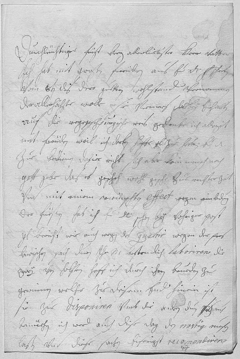 0001Durchleüchtiger Fürst, herz allerliebster herr vatter 0002Ich hab mit großen freüden aus ewer Durchlaucht gnädigstem schreiben 0003vom 8ten dis dero guetten wohlstand vernommen, 0004der allerhöchste wolle sie verners dabey erhalten. 0005Auf die regenschpurgische reis gedenke ich allezeit 0006mit freüden, weil ich dorten hoffe, die gnade zue haben, ewer Durchlaucht 0007zue bedienen. Dahier richt sich aber kein mensch noch, 0008gott gebe, das es gescheh, wohl gesche, zue rechter zeit 0009vnd mit einem erwünschten effect. Wegen einladung 0010der fürsten hab ich ewer Durchlaucht schon bey vohriger post 0011gehorsamst bericht wie auch wegen des quartir. Wegen der pres- 0012lawischen sach duen ihr Mayestät bestendich laboriren. Die 0013zwey von Holstein hoff ich durch ihren bruedern zue 0014gewinnen, welcher zue diesem end hinein ist, 0015sie zue disponiren, vmb die andren duen sich auch 0016bemüehn. Ich werd auch dise dag den Nostiz ruefen 0017laßen vnd diese sachen eiferigst recomendiren.
