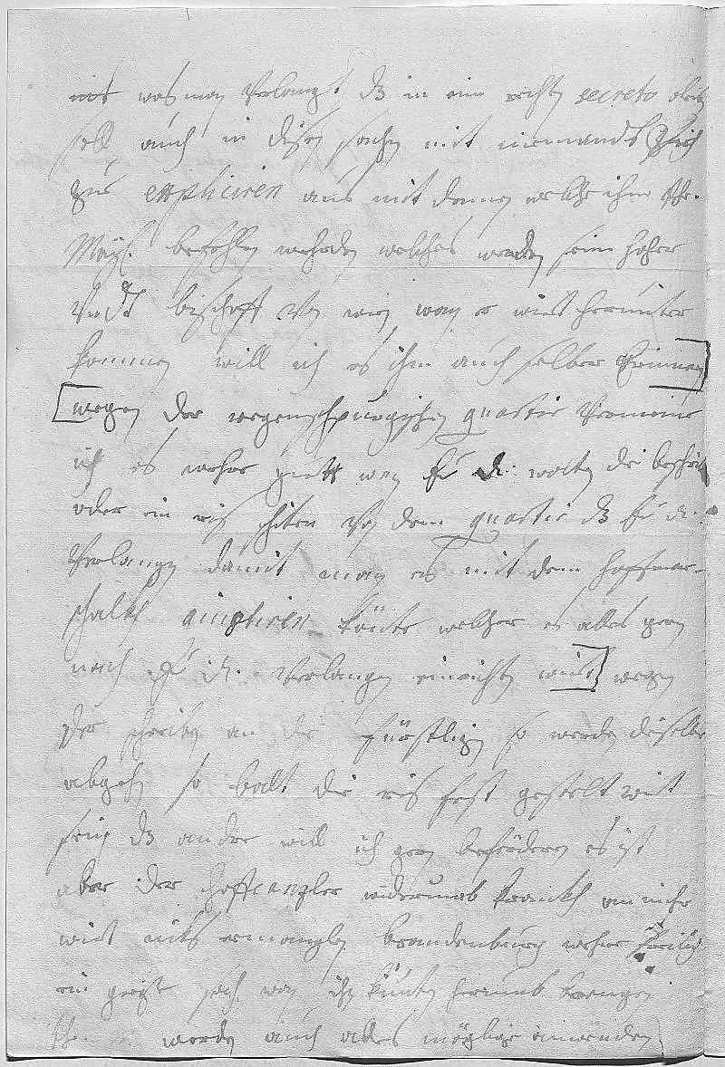 0017nit was man verlanget, das in ein rechten secreto bleibe. 0018Soll auch in disen sachen mit niemandt sich 0019zue expliciren auser mit dennen, welche ihme ihr 0020Mayestät befehlen wehrden, welches werden sein Hoher 0021vndt Bischoff von Wien . Wan er wirt herunter 0022kommen, will ich es ihm auch selber erinnern. 0023Wegen der regenschpurgischen quartir vermeine 0024ich, es wehre guett, wan ewer Durchlaucht wolten die beschribung0025oder ein ris schiken von dem quartir, das ewer Durchlaucht 0026verlangen, damit man es mit dem Hoffmar- 0027schalkh aiustiren könte, welcher es alles gern 0028nach ewer Durchlaucht verlangen einrichten wirt. Wegen 0029der schreiben an die fürstligen, so werden dieselbe 0030abgehn, so balt die reis fest gestelt wirt 0031sein. Das andre will ich gern beförderen, es ist 0032aber der Hoffcanzler widerumb krankh, an mihr 0033wirt niks ermanglen. Brandenburg wehre freilich 0034ein große sach, wan ihn kunten herumb brengen, 0035ihr Mayestät werden auch alles möglige anwenden.