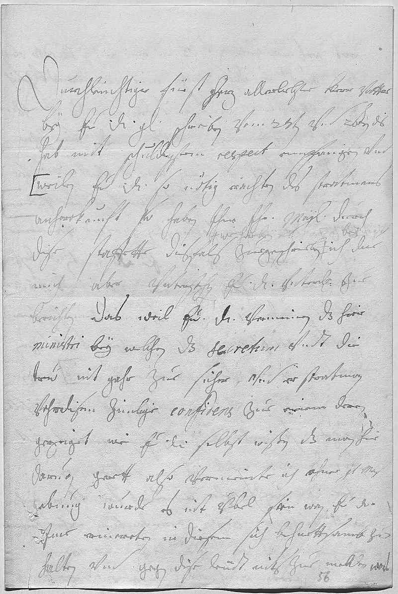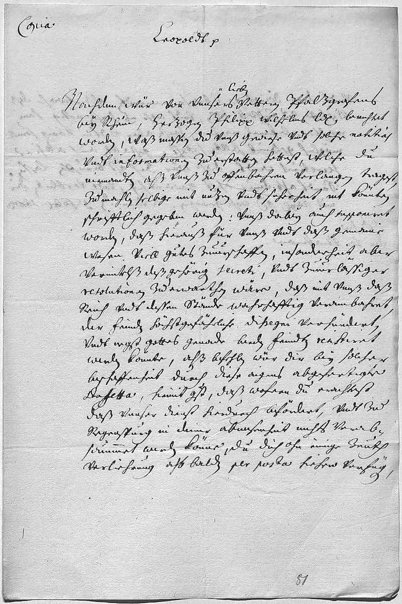 0001Durchleüchtiger Fürst, herz allerliebster herr vatter 0002Beyde ewer Durchlaucht gnädigen schreiben vom 21ten vnd 26ten dis0003hab mit schuldigstem respect empfangen. Vnd 0004weilen ewer Durchlaucht so nötig erachten, des Stratmans 0005anherokunft, so haben ihme ihr Mayestät durch 0006dise staffette disfals zuegeschrieben wie hirbey. Ich due 0007mich aber vnterstehn, ewer Durchlaucht vnterdehnigst zue 0008berichten, das, weil ewer Durchlaucht vermeinen, das hier 0009ministri, bey welchen das secretum vndt die 0010trew nit gahr zue sicher, vnd er Stratman 0011vohrdisem zimlige confidens zue einem deren 0012gezeiget, wie ewer Durchlaucht selbst wißen, das man hir 0013daruon gerett, also vermeinte ich, ohne gehorsamste mas- 0014gebung, wurde es nit übel sein, wan ewer Durchlaucht 0015ime erinereten, in diesem sich behuettsamb zue- 0016halten vnd gegen dise leüdt niks zue melden, was