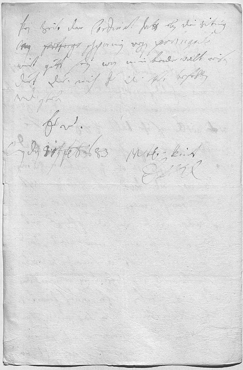 0018kein zeit. Der Cardinal hatt eben die zeitung 0019von Portuga Schpanien wegen Portugal, 0020wirt gutt sein, wan mein bruder balt reisen 0021duet. Due mich ewer Durchlaucht vnterdehnigst befehlen, 0022werd sterben 0023ewer Durchlaucht 0024vnterdehnigstes kint 0025EMT 0026Wien den 11ten februarij 1683
