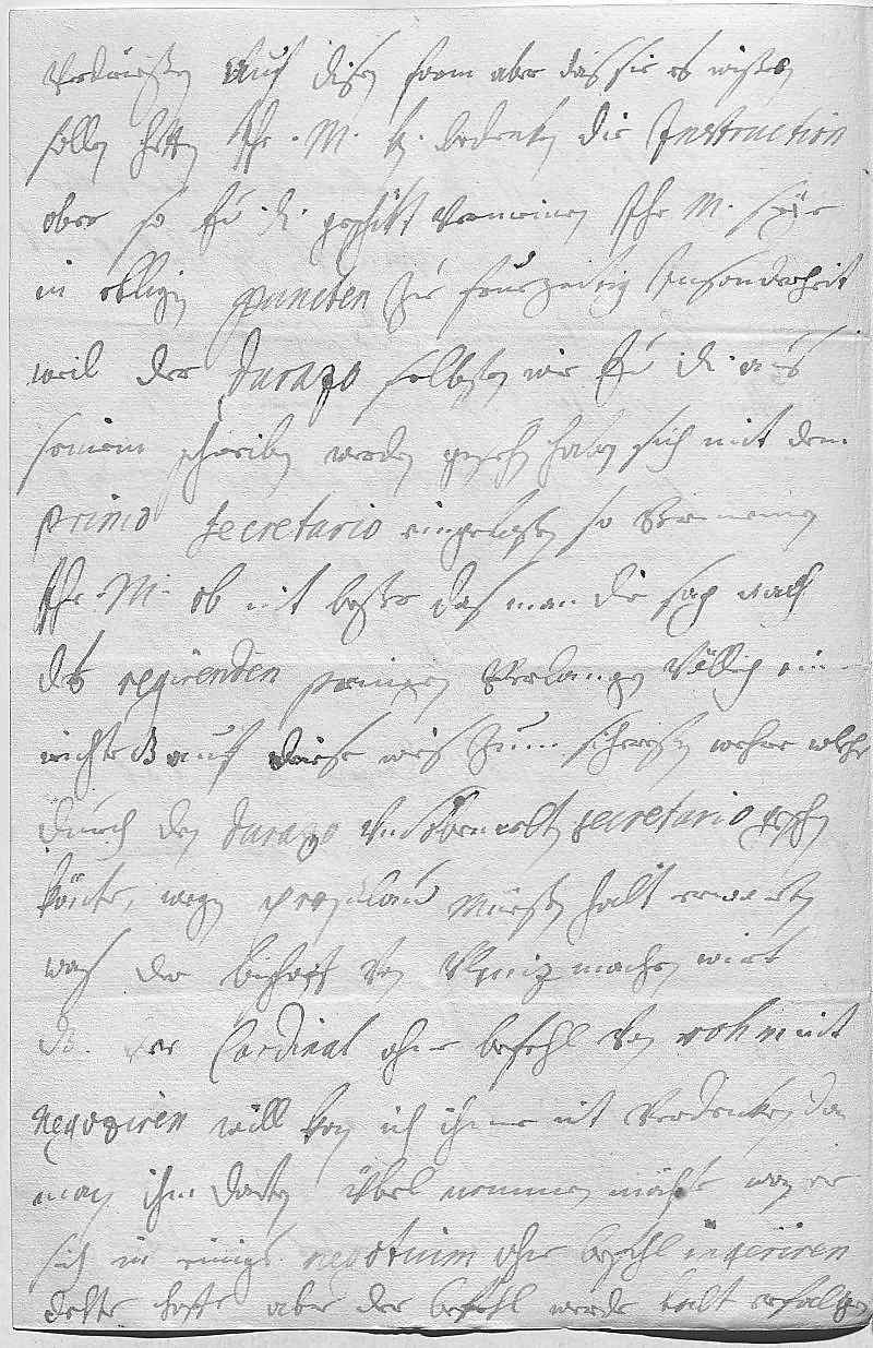 0017verdrießen. Auf disen form aber, das sie es wißen 0018sollen, hetten ihr Mayestät kein bedenken. Die instruction 0019aber, so ewer Durchlaucht geschikt, vermeinen ihr Mayestät, seye 0020in etligen puncten zue fruezeitig, insonderheit 0021weil der Durazo selbsten, wie ewer Durchlaucht aus 0022seinem schreiben werden gesehn haben, sich mit dem 0023Primo Secretario eingelaßen. So vermeinen 0024ihr Mayestät, ob nit beßer, das man die sag nach 0025des regirenden Prinzen verlangen völlig ein- 0026richte, das auf diese weis zum sicheresten wehre, welchs 0027durch den Durazo vnd obemelten Secretario geschen 0028könte. Wegen Preßlaw müeßen wir halt erwarten, 0029was der Bischoff von Vlmiz machen wirt. 0030Das der Cardinal ohne befehl von Rohm nit 0031negoziren will, kan ich ihme nit verdenken, dan 0032man ihm dorten übel nemmen möchte, wan er 0033sich in einigs negotium ohne befehl ingeriren 0034dehte, hoffe aber, der befehl werde balt erfolgen.