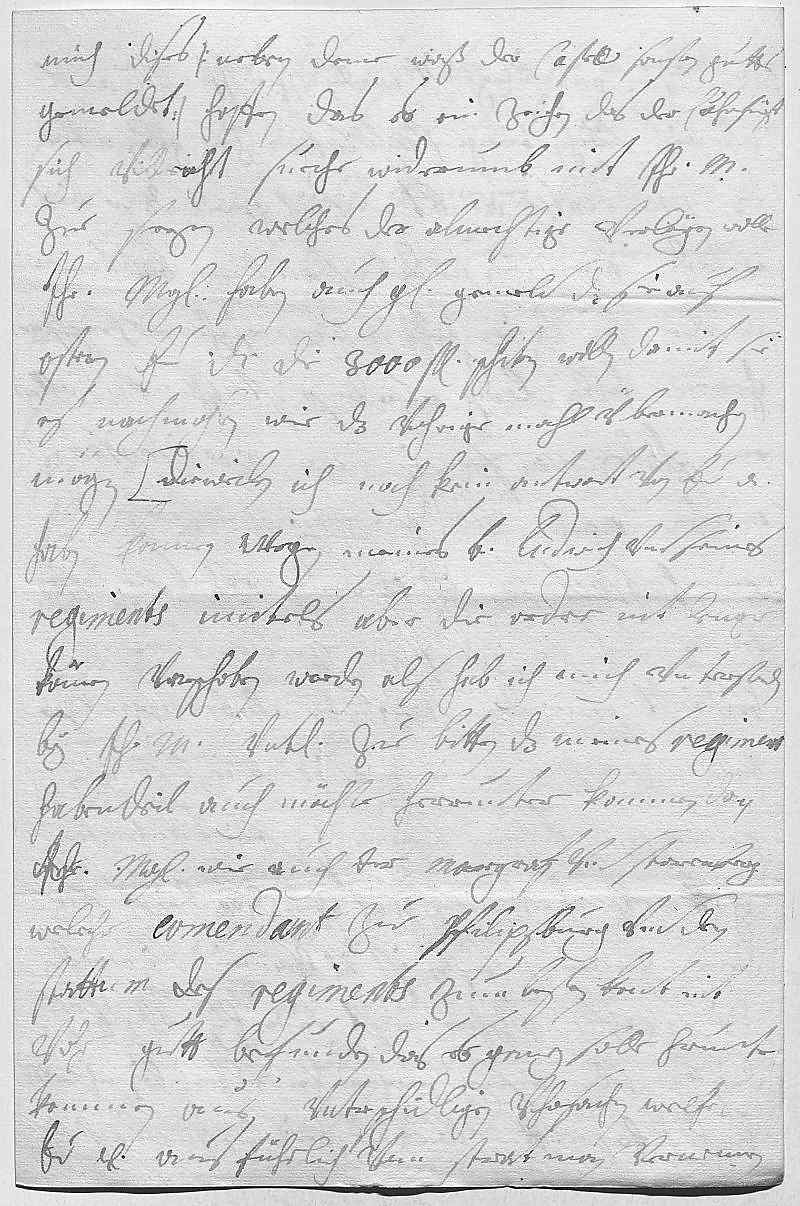 0053auch dises (neben deme, waß der Castell sonsten gutts 0054gemeldet) hoffen, das es ein zeichen, das der Cuhrfürst 0055sich villeicht sueche widerumb mit ihr Mayestät 0056ins benehmen zue sezen, welches der almechtige verleyen wolle. 0057Ihr Mayestät haben auch gnädigst gemeld, das sie auf 0058ostern ewer Durchlaucht die 3000 gulden schiken wollen, damit sie 0059es nachmahlen wie das vohrige mahl übermachen 0060mögen. Dieweilen ich noch kein antwort von ewer Durchlaucht 0061haben konnen wegen meines bruders Ludwich vnd seines 0062regiments, inmitels aber die order nit lenger 0063können verschoben worden, als hab ich mich vnterstanden, 0064bey ihr Mayestät vnterdehnigst zue bitten, das meines bruders regiment 0065halbendeil auch möchte herrunter kommen, dan 0066ihr Mayestät wie auch der Margraf vnd Starenberg, 0067welcher comendant zue Pfilipsburg vnd den 0068stattum des regiments zum besten kent, nit 0069vohr gutt befunden, das es ganz solle herunter 0070kommen, aus vnterschidligen vhrsachen, welche 0071ewer Durchlaucht aus führlich vom Stratman vernemen