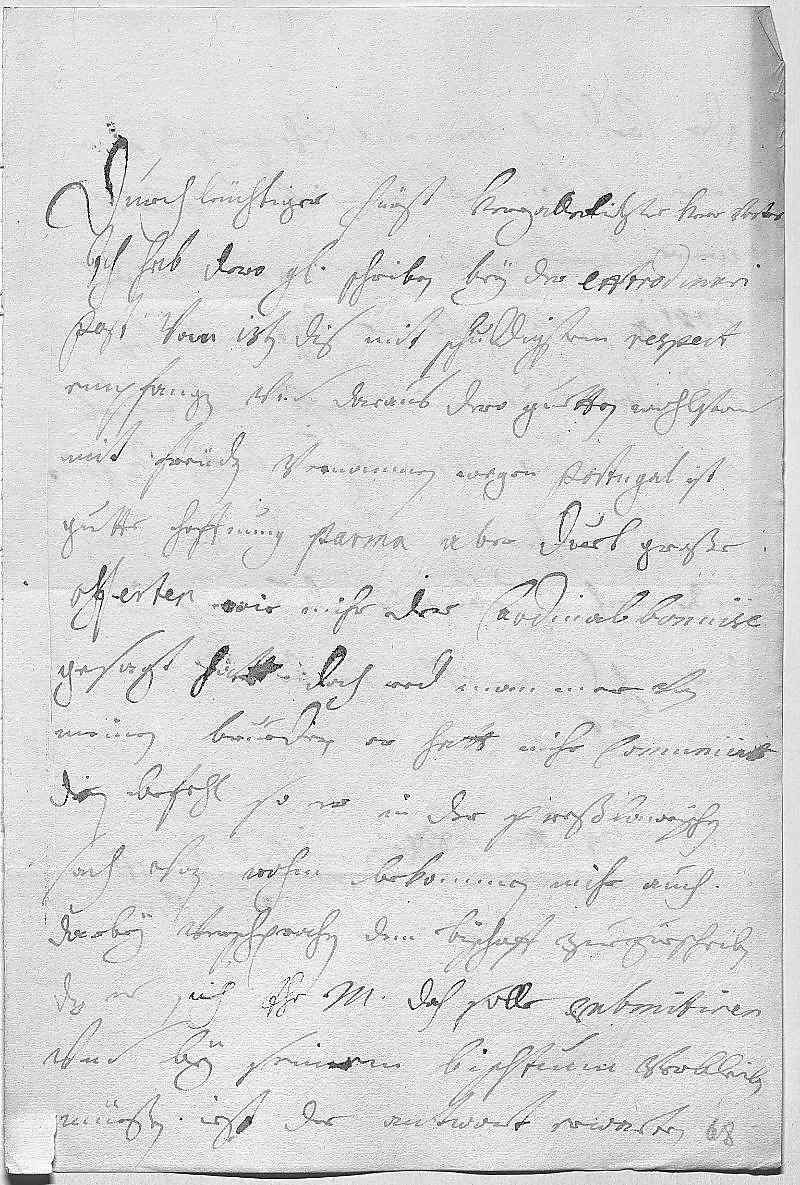 0001Durchleüchtiger Fürst, herzallerliebster herr vatter 0002Ich hab dero gnädigstes schreiben bey der extraordinari 0003post vom 13ten dis mit schuldigstem respect 0004empfangen vnd daraus dero guetten wohlstand 0005mit freüden vernommen. Wegen Portugal ist 0006gutte hoffnung, Parma aber duet große 0007offerten, wie mihr der Cardinal Bonuise 0008gesagt hatt, doch red man mer von 0009meinen brüedern. Er hatt mihr comunicirt 0010den befehl, so er in der preßlawischen 0011sach von Rohm bekommen, mihr auch 0012darbey verschprochen, dem Bischoff zuezueschreiben, 0013das er sich ihr Mayestät doch solle submitiren 0014vnd bey seinem bischtum verbleiben. 0015Müeßen jezt der antwort erwarten.
