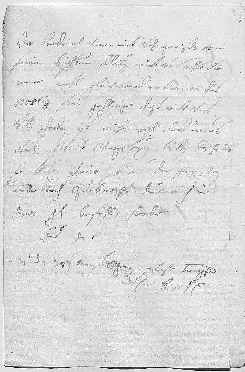 0016Der Cardinal vermeint vohr gewis, das er in 0017seinem bischtum bleiben wirt vnd also die 0018newe wahl gleich werd intimiren. Des 0019Nostiz sein gehlinger doht wirt vns 0020vill schaden, ist mihr wohl leid. Mues 0021vnterdehnigst vmb vergebung bitten, das heüt 0022so kurz schreib, seind den ganzen dag 0023in der kirch zuebracht. Due mich in 0024dero gnade befehlen, sterbe 0025ewer Durchlaucht 0026ganz ergebenste trewgehorsamste 0027dochter EMT 0028Wien den 28ten merz 1683