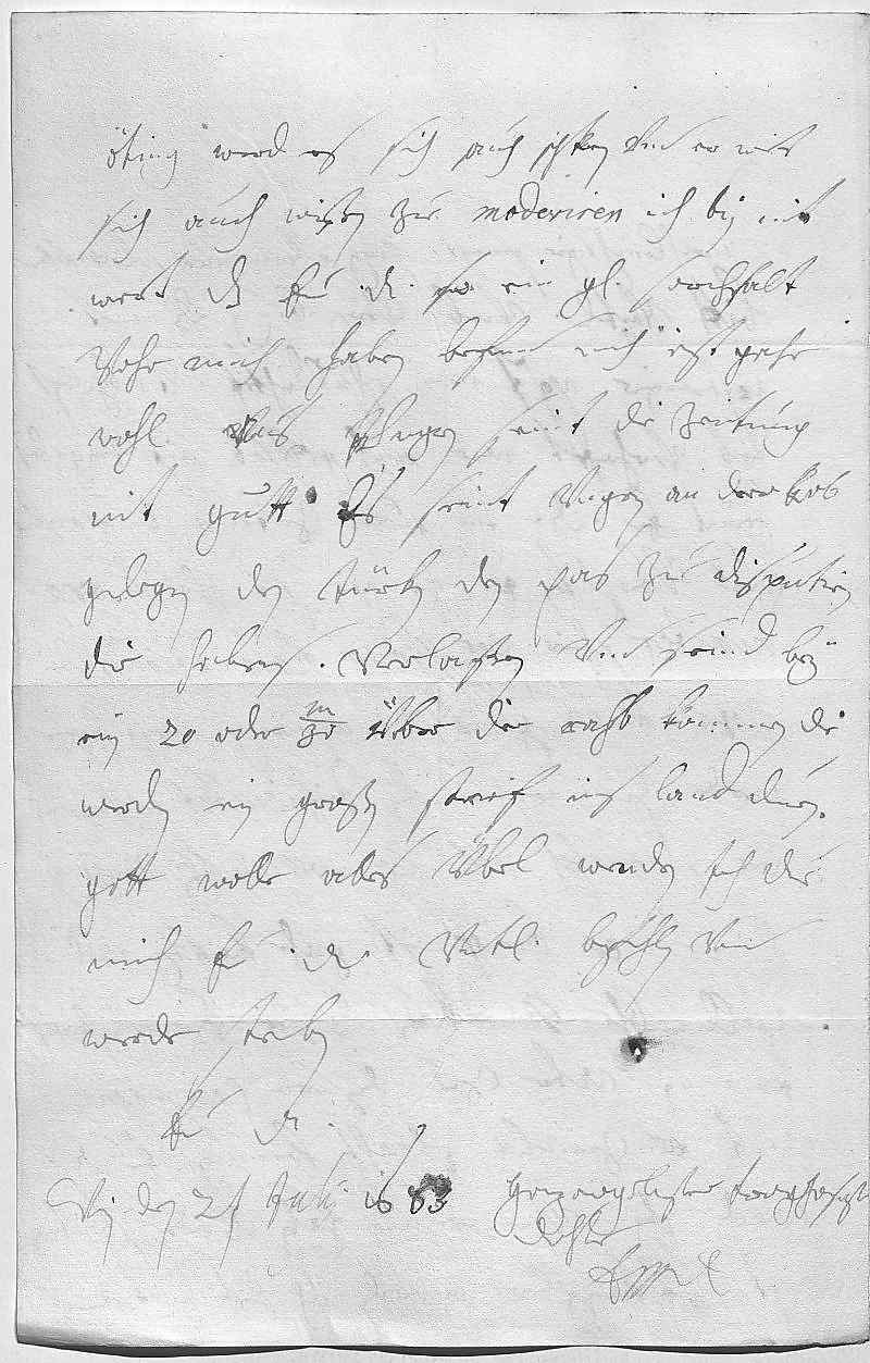 0017Öting werd es sich auch schiken, vnd er wirt 0018sich auch wißen zue moderiren. Ich bin nit 0019wert, das ewer Durchlaucht so ein gnädige sorchfalt 0020vohr mich haben, befind mich jezt gahr 0021wohl. Aus Vngren seint die zeitung 0022nit gutt, es seint vngren an dero Rab 0023gelegen, den türken den pas zue disputirn, 0024die habens verlaßen vnd seind bey 0025ein 20 oder 30 000 über die Rahb kommen, die 0026werden ein großen streif ins land duen, 0027gott wolle alles übel wenden. Ich due 0028mich ewer Durchlaucht vnterdehnigst befehlen vnd 0029werde sterben 0030ewer Durchlaucht 0031ganzergebenste trewgehorsamste 0032dochter 0033EMT 0034Wien den 2ten julij 1683