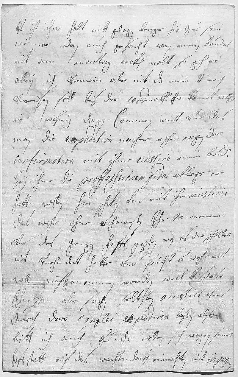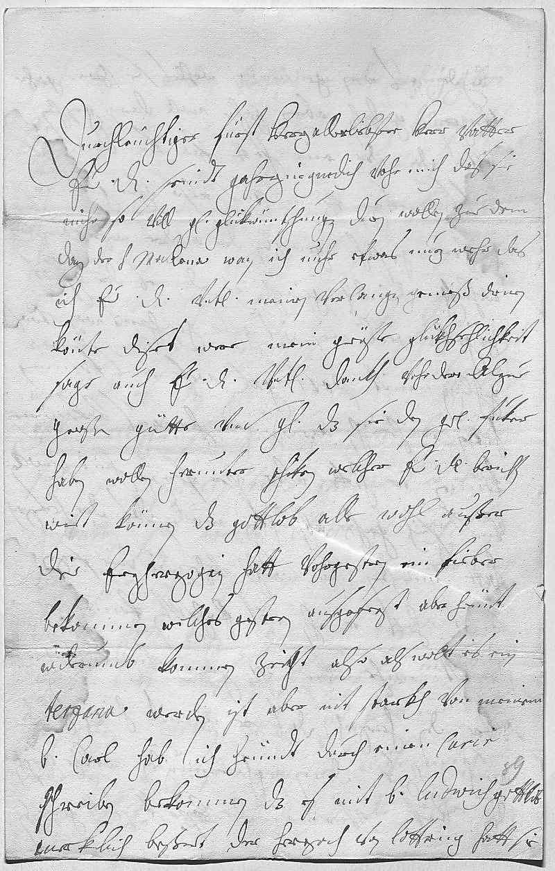 0001Durchleüchtiger Fürst, herz allerliebster herr vatter 0002Ewer Durchlaucht seindt gahrzuegnedich vohr mich, das sie 0003mihr so vill gnädige glükwüntschungen duen wollen zue dem 0004dag der heiligen Madlena. Wan ich nuhr etwas nuz wehr, das 0005ich ewer Durchlaucht vnterdehnigst meinen verlangen gemeß dienen 0006könte, dises were mein gröste glükhsehlichkeit. 0007Sage auch ewer Durchlaucht vnterdehnigsten dankh vohr dero alzue 0008große güette vnd gnade, das sie den Grav Fuker 0009haben wollen herunter schiken, welcher ewer Durchlaucht berichten 0010wirt können, das gottlob alle wohl, außer 0011die Erzherzogin hatt vohrgestern ein fieber 0012bekommen, welches gestren ausgesezt, aber heünt 0013widerumb kommen. Zeicht also, als wolt es ein 0014terzana werden, ist aber nit starkh. Von meinem 0015bruder Carl hab ich heündt durch einen curier 0016schreiben bekommen, das es sich mit bruder Ludwich gottlob 0017merklich beßert. Der Herzoch von Lottring hatt sie