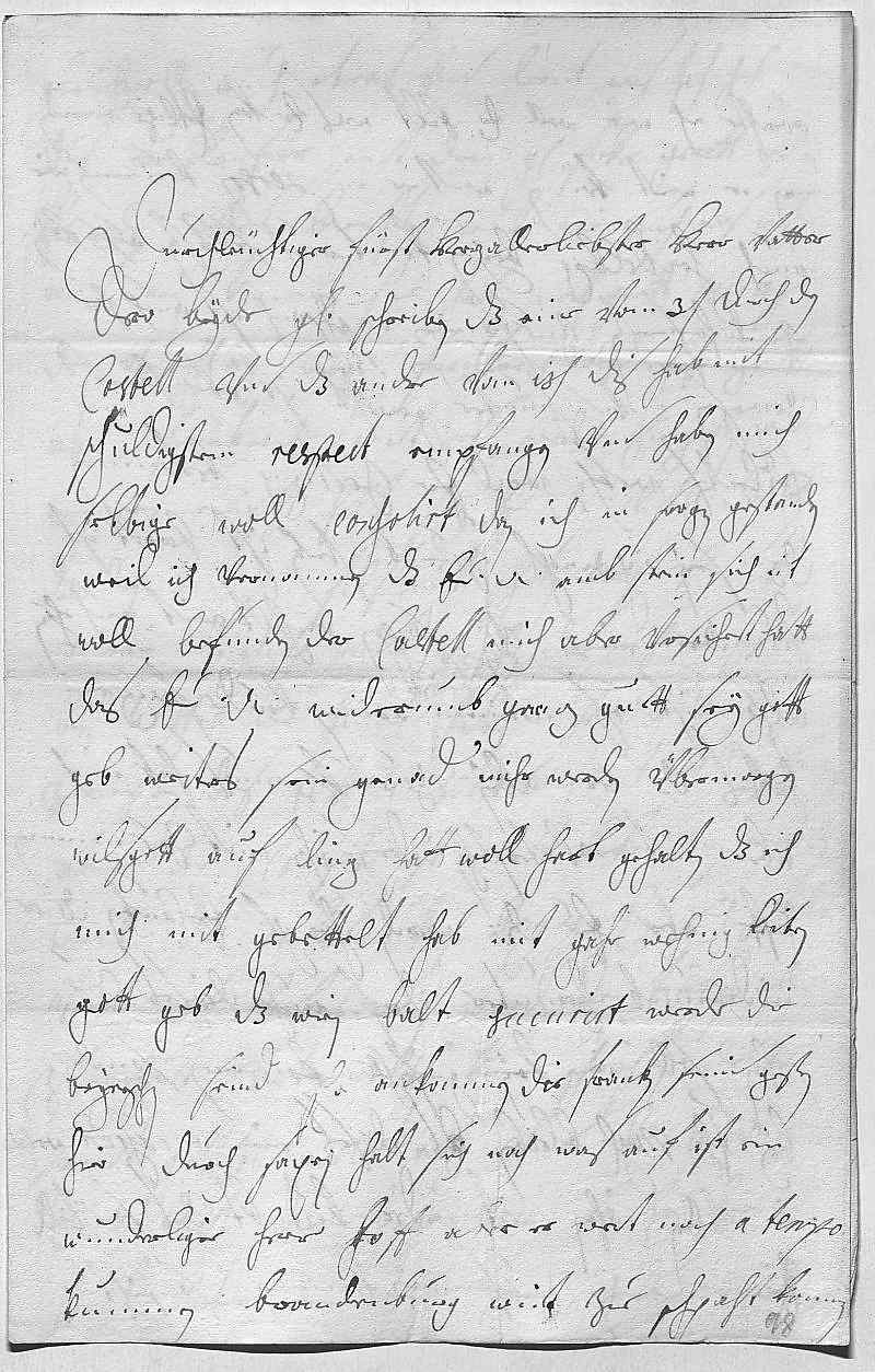 0001Durchleüchtiger Fürst, herz allerliebster herr vatter 0002Dero beyde gnädige schreiben, das eine vom 3ten durch den 0003Castell vnd das ander vom 13ten dis, hab mit 0004schuldigstem respect empfangen. Vnd haben mich 0005selbige woll consolirt, dan ich in sorgen gestanden, 0006weil ich vernommen, das ewer Durchlaucht amb stein sich nit 0007woll befunden, der Castell mich aber versichert hatt, 0008das ewer Durchlaucht widerumb ganz guett sey, gott 0009geb weiters sein genad. Mihr werden übermorgen 0010wilsgott auf Linz, hatt woll hart gehalten, das ich 0011mich mit gebettelt hab mit gahr wehnig leiten. 0012Gott geb, das Wien balt sucurirt werde. Die 0013beyerschen seind schon ankommen, die franken seind gestren 0014hier durch. Saxen halt sich noch was auf, ist ein 0015wunderliger herr, hoff aber, er wert noch a tempo 0016kummen. Brandenburg wirt zue schpaht komen,