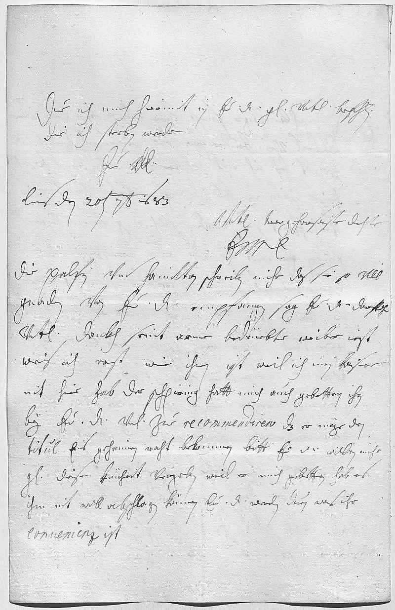 0017due ich mich hiermit in ewer Durchlaucht gnade vnterdehnigst befehlen, 0018die ich sterben werde 0019ewer Durchlaucht 0020vnterdehnigst trewgehorsamste dochter 0021EMT 0022Lins den 20ten septembris 16830023Die Palfin vnd Hamilton schreiben mihr, das sie so vill 0024gnaden von ewer Durchlaucht empfangen, sag ewer Durchlaucht darfohr 0025vnterdehnigsten dankh, seint arme bedrüebte weiber. Izt 0026weis ich erst, wie ihnen ist, weil ich mein Kaiser 0027nit hier hab. Der Schpiring hatt mich auch gebetten, ihn 0028bey ewer Durchlaucht vnterdehnigst zue recommendiren, das er möge den 0029titul eins geheimen raht bekommen. Bitt, ewer Durchlaucht wollen mihr 0030gnädig diese küenheit vergeben, weil er mich gebetten, hab es 0031ihm nit woll abschlagen können. Ewer Durchlaucht werden duen, was ihr 0032conuenienz ist.