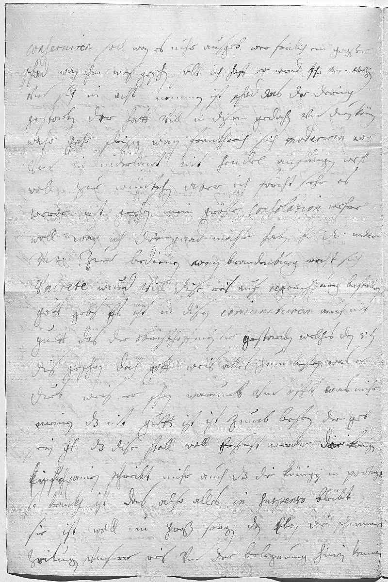 0021conseruiren soll, wan es nuhr ausgeb, wer freilich ein großer 0022schad, wan ihm was geschen solt. Ich hoff, er werd ihr Mayestät volgen 0023vnd sich in acht nemmen. Ist schad, das der Dering 0024gestorben, der hatt vill in disem gedahn vnd duen könen, 0025wahr gahr fleisig. Wan Frankhreich sich moderiren wolt 0026vnd in Niderlant nit hendel anfangen, wehr 0027woll zue wüntschen, aber ich förcht sehr, es 0028werde nit geschen. Mein gröste consolation wehre 0029woll, wann ich die gnad möchte haben, ewer Durchlaucht wider 0030vnterdehnigst zue bedienen. Wan Brandenburg recht sich 0031vnirete, wurd es vill dise reis auf Regenschpurg befördern, 0032gott gebs. Es ist in disen coniuncturen auch nit 0033guett, das der Obristhoffmeister gestorben, welches den 5ten 0034dies geschen, doch gott weis alles zum besten, was er 0035duet, weis er schon warumb vnd offt, was mihr 0036meinen, das nit guett ist, ist zumb besten. Der geb 0037ein gnade, das dise stell woll ersest werde. Die Königin 0038in Schpanien schreibt mihr auch, das die Königin in Portugal 0039so krankh ist, das also alles in suspenso bleibt. 0040Sie ist woll in grosen sorgen, dan eben die schlimme 0041zeitung vnsrer reis vnd der belegrung hinein kommen.