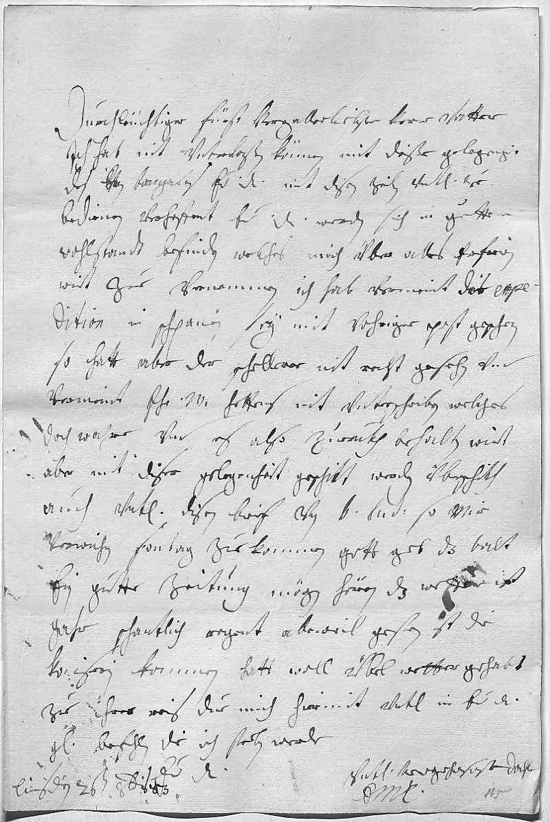 0001Durchleüchtiger Fürst, herzallerliebster herr vatter 0002Ich hab nit vnterlaßen können, mit dißer gelegenheit 0003des von Bongarts ewer Durchlaucht mit disen zeilen vnterdehnigst zue 0004bedienen, verhoffent, ewer Durchlaucht werden sich in guettem 0005wohlstandt befinden, welches mich über alles erfrewen 0006wirt zue vernemmen. Ich hab vermeint, die expe- 0007dition in Schpanien sey mit vohriger post geschen, 0008so hatt aber der Schellerer nit recht gesehn vnd 0009vermeint, ihr Mayestät hettens nit vnterschriben, welches 0010doch wahre, vnd es also zurukh behalten. Wirt 0011aber mit diser gelegenheit geschikt werden. Überschikh 0012auch vnterdehnigst disen brief von bruder Ludwig, so mir 0013verwichen sontag zue kommen, gott geb, das balt 0014ein gutte zeitung mögen hören. Das wetter ist 0015gahr schantlich, regent alleweil. Gestern ist die 0016Kaiserin kommen, hatt woll übel wetter gehabt 0017zue ihrer reis. Due mich hiermit vnterdehnigst in ewer Durchlaucht 0018gnade befehlen, die ich sterben werde 0019ewer Durchlaucht 0020vnterdehnigst trewgehorsamste dochter 0021EMT 0022Lins den 26ten octobris 1683