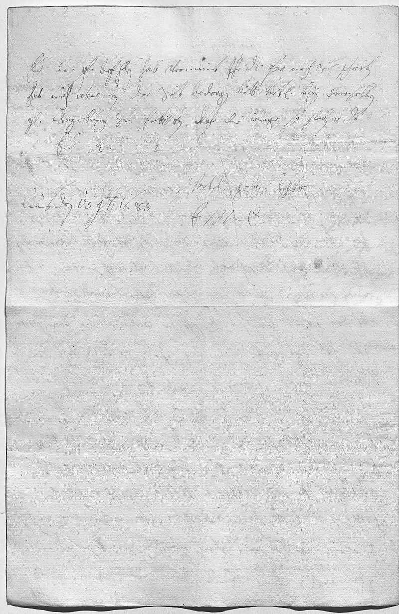 0062ewer Durchlaucht gnade befehlen. Hab vermeint ihr Durchlaucht fraw mutter noch zu schreiben, 0063hab mich aber in der zeit bedrogen, bitt vnterdehnigst, bey deroselben 0064gnädigste vergebung zue erbitten vohr die ienige, so sterben wirdt 0065ewer Durchlaucht 0066vnterdehnigst gehorsamste dochter 0067EMT 0068Lins den 13 novembris 1683